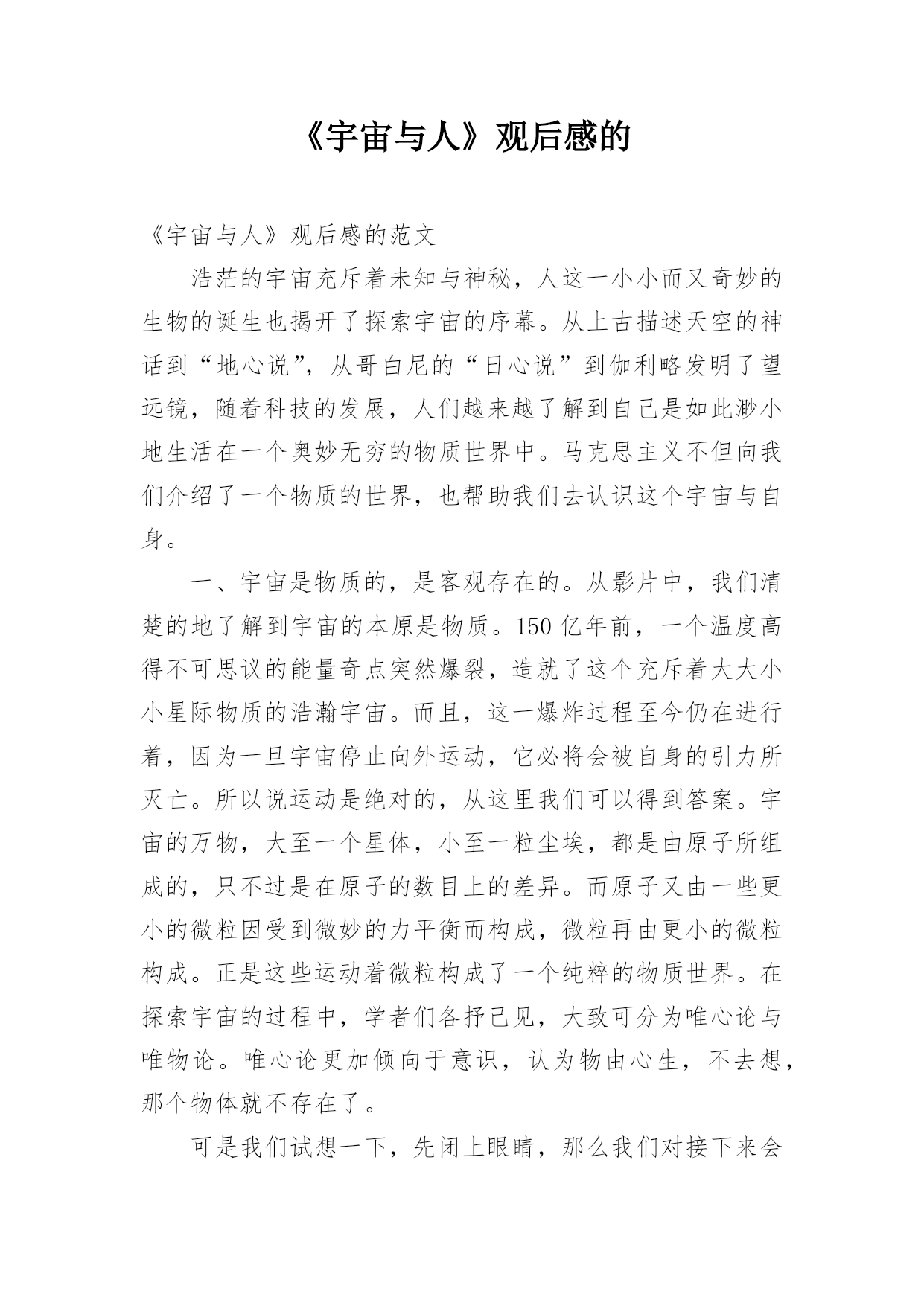 《宇宙与人》观后感的《宇宙与人》观后感的范文浩茫的宇宙充斥着未知与神秘,人这一小小而又奇妙的生物的诞生也揭开了探索宇宙的序幕。从上古描述天空的神话到“地心说”,从哥白尼的“日心说”到伽利略发明了望远镜,随着科技的发展,人们越来越了解到自己是如此渺小地生活在一个奥妙无穷的物质世界中。马克思主义不但向我们介绍了一个物质的世界,也帮助我们去认识这个宇宙与自身。一、宇宙是物质的,是客观存在的。从影片中,我们清楚的地了解到宇宙的本原是物质。150亿年前,一个温度高得不可思议的能量奇点突然爆裂,造就了这个充斥着大大小