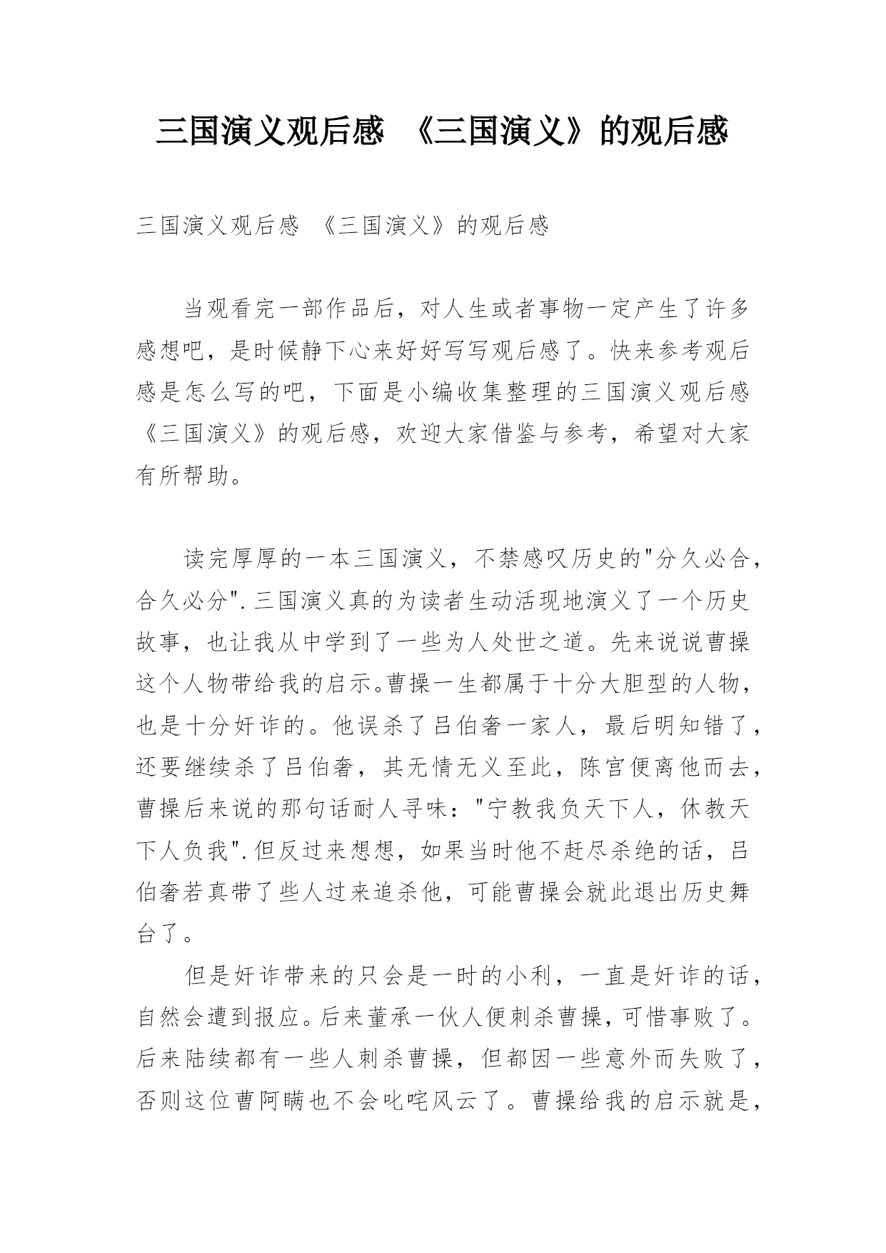 三国演义观后感《三国演义》的观后感三国演义观后感《三国演义》的观后感当观看完一部作品后,对人生或者事物一定产生了许多感想吧,是时候静下心来好好写写观后感了。快来参考观后感是怎么写的吧,下面是小编收集整理的三国演义观后感《三国演义》的观后感,欢迎大家借鉴与参考,希望对大家有所帮助。读完厚厚的一本三国演义,不禁感叹历史的"分久必合,合久必分".三国演义真的为读者生动活现地演义了一个历史故事,也让我从中学到了一些为人处世之道。先来说说曹操这个人物带给我的启示。曹操一生都属于十分大胆型的人物,也是十分奸诈的。他误