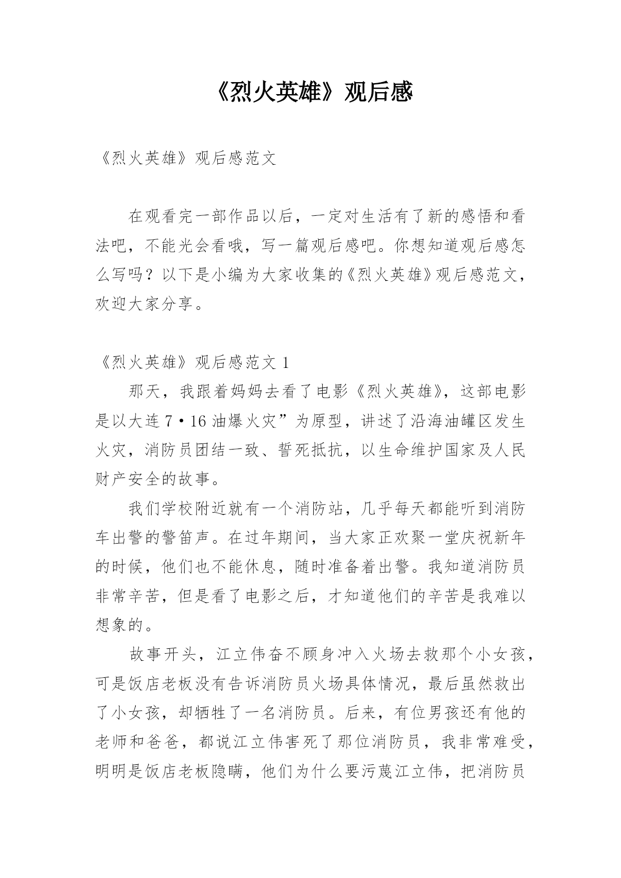 《烈火英雄》观后感《烈火英雄》观后感范文在观看完一部作品以后,一定对生活有了新的感悟和看法吧,不能光会看哦,写一篇观后感吧。你想知道观后感怎么写吗?以下是小编为大家收集的《烈火英雄》观后感范文,欢迎大家分享。《烈火英雄》观后感范文1那天,我跟着妈妈去看了电影《烈火英雄》,这部电影是以大连7·16油爆火灾”为原型,讲述了沿海油罐区发生火灾,消防员团结一致、誓死抵抗,以生命维护国家及人民财产安全的故事。我们学校附近就有一个消防站,几乎每天都能听到消防车出警的警笛声。在过年期间,当大家正欢聚一堂庆祝新年的时候,