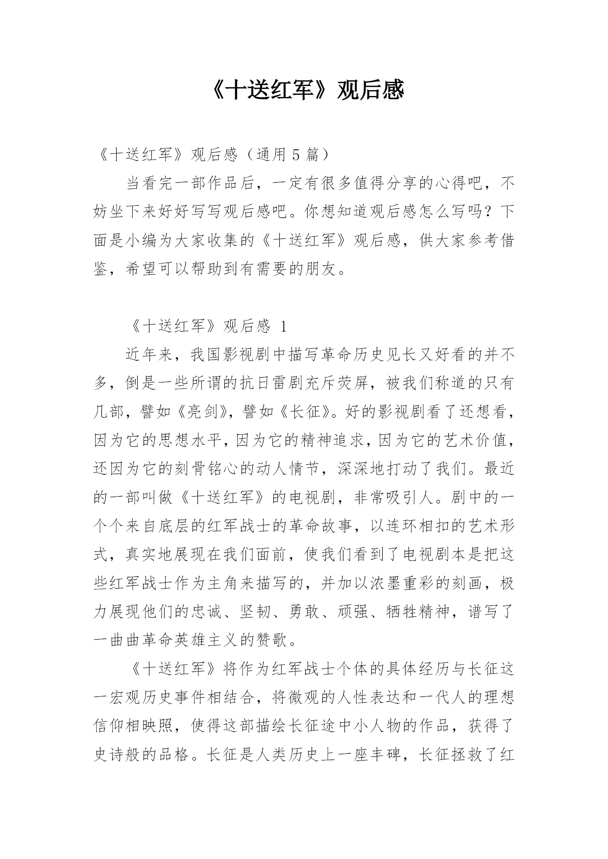《十送红军》观后感《十送红军》观后感(通用5篇)当看完一部作品后,一定有很多值得分享的心得吧,不妨坐下来好好写写观后感吧。你想知道观后感怎么写吗?下面是小编为大家收集的《十送红军》观后感,供大家参考借鉴,希望可以帮助到有需要的朋友。《十送红军》观后感1近年来,我国影视剧中描写革命历史见长又好看的并不多,倒是一些所谓的抗日雷剧充斥荧屏,被我们称道的只有几部,譬如《亮剑》,譬如《长征》。好的影视剧看了还想看,因为它的思想水平,因为它的精神追求,因为它的艺术价值,还因为它的刻骨铭心的动人情节,深深地打动了我们。