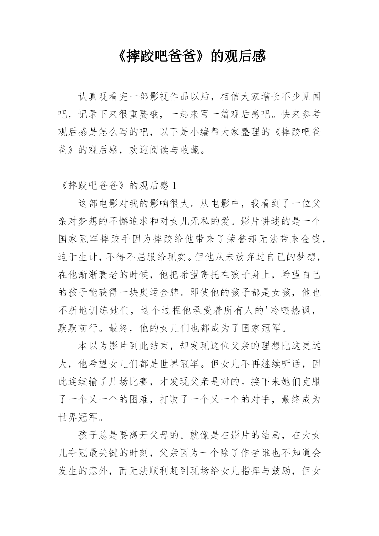 《摔跤吧爸爸》的观后感认真观看完一部影视作品以后,相信大家增长不少见闻吧,记录下来很重要哦,一起来写一篇观后感吧。快来参考观后感是怎么写的吧,以下是小编帮大家整理的《摔跤吧爸爸》的观后感,欢迎阅读与收藏。《摔跤吧爸爸》的观后感1这部电影对我的影响很大。从电影中,我看到了一位父亲对梦想的不懈追求和对女儿无私的爱。影片讲述的是一个国家冠军摔跤手因为摔跤给他带来了荣誉却无法带来金钱,迫于生计,不得不屈服给现实。但他从未放弃过自己的梦想,在他渐渐衰老的时候,他把希望寄托在孩子身上,希望自己的孩子能获得一块奥运金牌