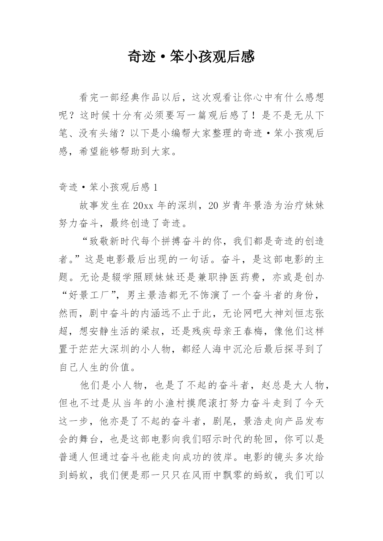 奇迹·笨小孩观后感看完一部经典作品以后,这次观看让你心中有什么感想呢?这时候十分有必须要写一篇观后感了!是不是无从下笔、没有头绪?以下是小编帮大家整理的奇迹·笨小孩观后感,希望能够帮助到大家。奇迹·笨小孩观后感1故事发生在20xx年的深圳,20岁青年景浩为治疗妹妹努力奋斗,最终创造了奇迹。“致敬新时代每个拼搏奋斗的你,我们都是奇迹的创造者。”这是电影最后出现的一句话。奋斗,是这部电影的主题。无论是辍学照顾妹妹还是兼职挣医药费,亦或是创办“好景工厂”,男主景浩都无不饰演了一个奋斗者的身份,然而,剧中奋斗的内