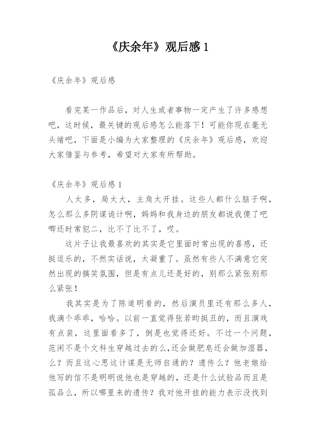 《庆余年》观后感1《庆余年》观后感看完某一作品后,对人生或者事物一定产生了许多感想吧,这时候,最关键的观后感怎么能落下!可能你现在毫无头绪吧,下面是小编为大家整理的《庆余年》观后感,欢迎大家借鉴与参考,希望对大家有所帮助。《庆余年》观后感1人太多,局太大,主角太开挂。这些人都什么脑子啊,怎么那么多阴谋诡计啊,妈妈和我身边的朋友都说我傻了吧唧还时常犯二,比不了比不了,哎。这片子让我最喜欢的其实是它里面时常出现的喜感,还挺逗乐的,不然实话说,太凝重了。虽然有些人不满意它突然出现的搞笑氛围,但是有点儿还是好的,