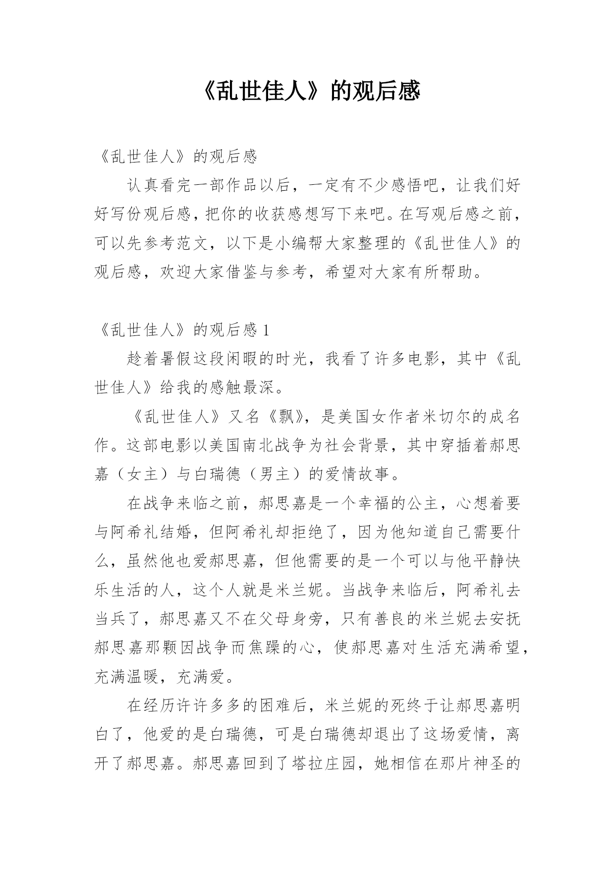 《乱世佳人》的观后感《乱世佳人》的观后感认真看完一部作品以后,一定有不少感悟吧,让我们好好写份观后感,把你的收获感想写下来吧。在写观后感之前,可以先参考范文,以下是小编帮大家整理的《乱世佳人》的观后感,欢迎大家借鉴与参考,希望对大家有所帮助。《乱世佳人》的观后感1趁着暑假这段闲暇的时光,我看了许多电影,其中《乱世佳人》给我的感触最深。《乱世佳人》又名《飘》,是美国女作者米切尔的成名作。这部电影以美国南北战争为社会背景,其中穿插着郝思嘉(女主)与白瑞德(男主)的爱情故事。在战争来临之前,郝思嘉是一个幸福的公