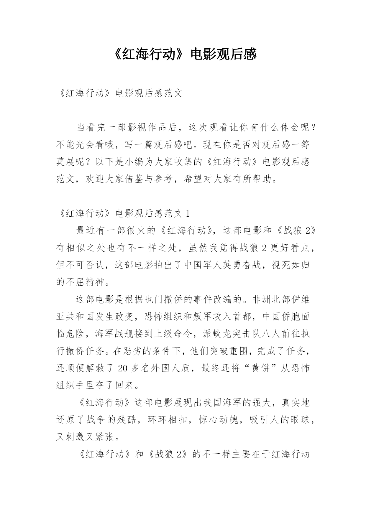 《红海行动》电影观后感《红海行动》电影观后感范文当看完一部影视作品后,这次观看让你有什么体会呢?不能光会看哦,写一篇观后感吧。现在你是否对观后感一筹莫展呢?以下是小编为大家收集的《红海行动》电影观后感范文,欢迎大家借鉴与参考,希望对大家有所帮助。《红海行动》电影观后感范文1最近有一部很火的《红海行动》,这部电影和《战狼2》有相似之处也有不一样之处,虽然我觉得战狼2更好看点,但不可否认,这部电影拍出了中国军人英勇奋战,视死如归的不屈精神。这部电影是根据也门撤侨的事件改编的。非洲北部伊维亚共和国发生政变,恐怖