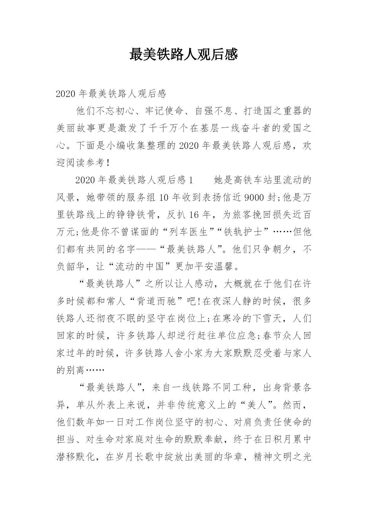 最美铁路人观后感2020年最美铁路人观后感他们不忘初心、牢记使命、自强不息、打造国之重器的美丽故事更是激发了千千万个在基层一线奋斗者的爱国之心。下面是小编收集整理的2020年最美铁路人观后感,欢迎阅读参考!2020年最美铁路人观后感1她是高铁车站里流动的风景,她带领的服务组10年收到表扬信近9000封;他是万里铁路线上的铮铮铁骨,反扒16年,为旅客挽回损失近百万元;他是你不曾谋面的“列车医生”“铁轨护士”……但他们都有共同的名字——“最美铁路人”。他们只争朝夕,不负韶华,让“流动的中国”更加平安温馨。“最