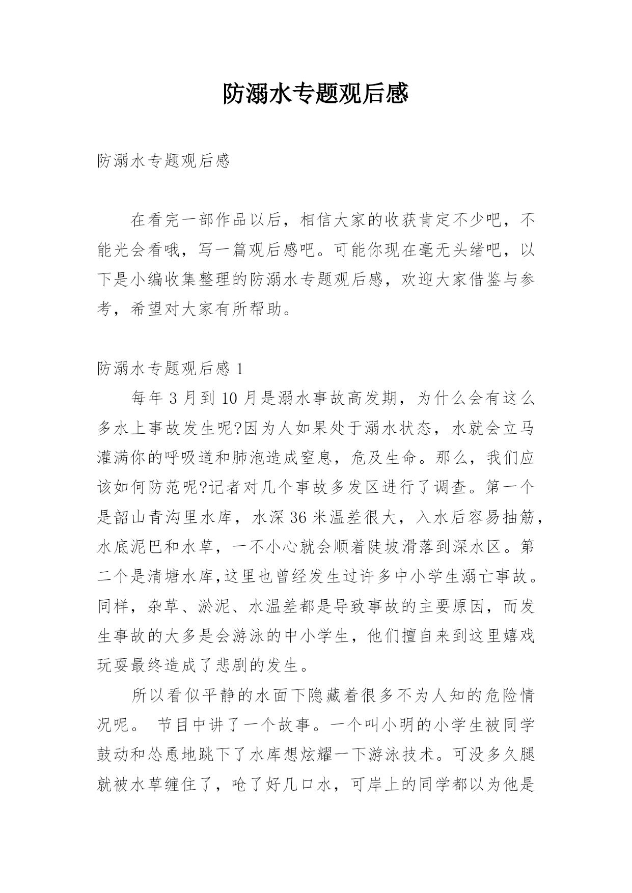 防溺水专题观后感防溺水专题观后感在看完一部作品以后,相信大家的收获肯定不少吧,不能光会看哦,写一篇观后感吧。可能你现在毫无头绪吧,以下是小编收集整理的防溺水专题观后感,欢迎大家借鉴与参考,希望对大家有所帮助。防溺水专题观后感1每年3月到10月是溺水事故高发期,为什么会有这么多水上事故发生呢?因为人如果处于溺水状态,水就会立马灌满你的呼吸道和肺泡造成窒息,危及生命。那么,我们应该如何防范呢?记者对几个事故多发区进行了调查。第一个是韶山青沟里水库,水深36米温差很大,入水后容易抽筋,水底泥巴和水草,一不小心就