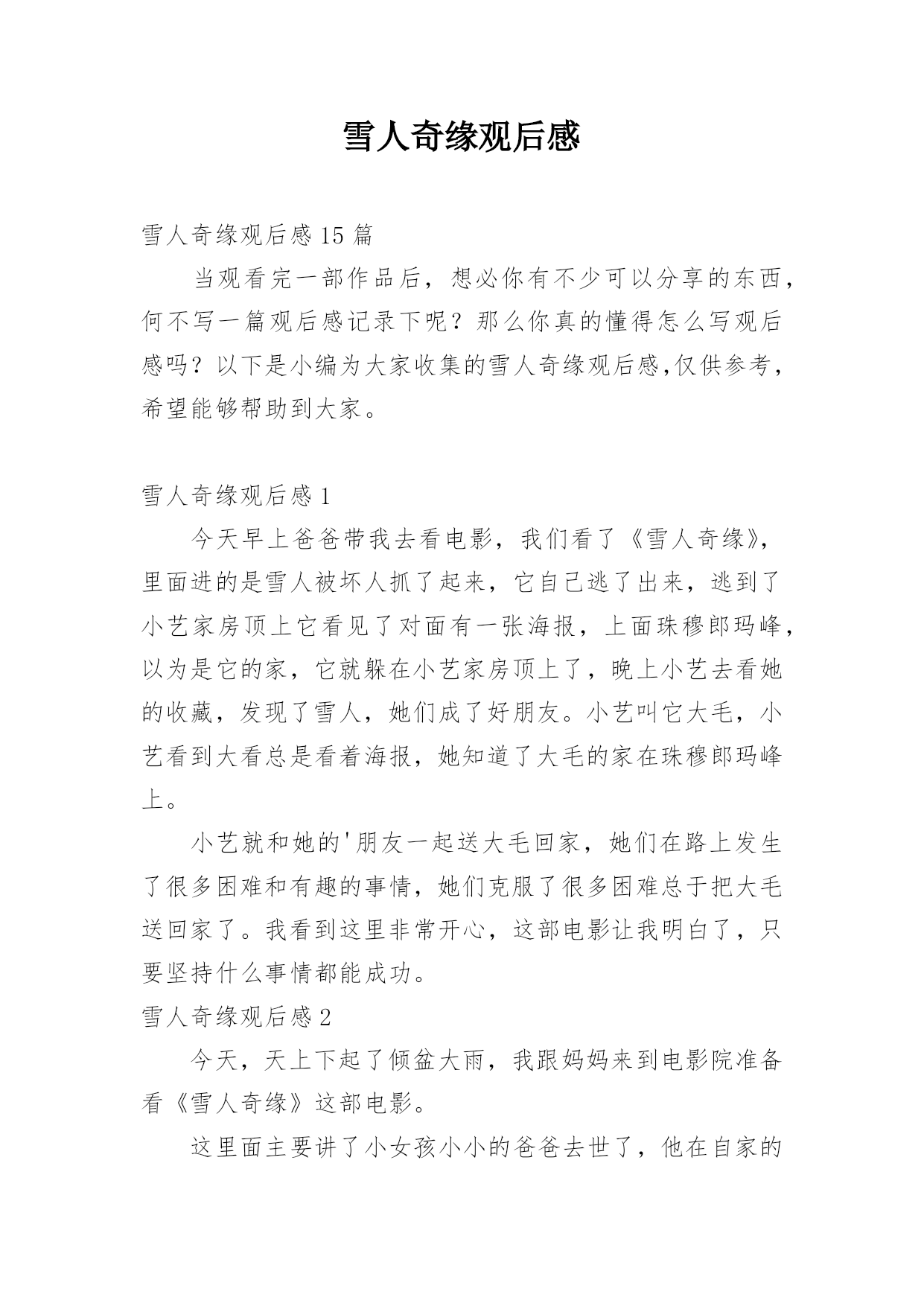 雪人奇缘观后感雪人奇缘观后感15篇当观看完一部作品后,想必你有不少可以分享的东西,何不写一篇观后感记录下呢?那么你真的懂得怎么写观后感吗?以下是小编为大家收集的雪人奇缘观后感,仅供参考,希望能够帮助到大家。雪人奇缘观后感1今天早上爸爸带我去看电影,我们看了《雪人奇缘》,里面进的是雪人被坏人抓了起来,它自己逃了出来,逃到了小艺家房顶上它看见了对面有一张海报,上面珠穆郎玛峰,以为是它的家,它就躲在小艺家房顶上了,晚上小艺去看她的收藏,发现了雪人,她们成了好朋友。小艺叫它大毛,小艺看到大看总是看着海报,她知道了