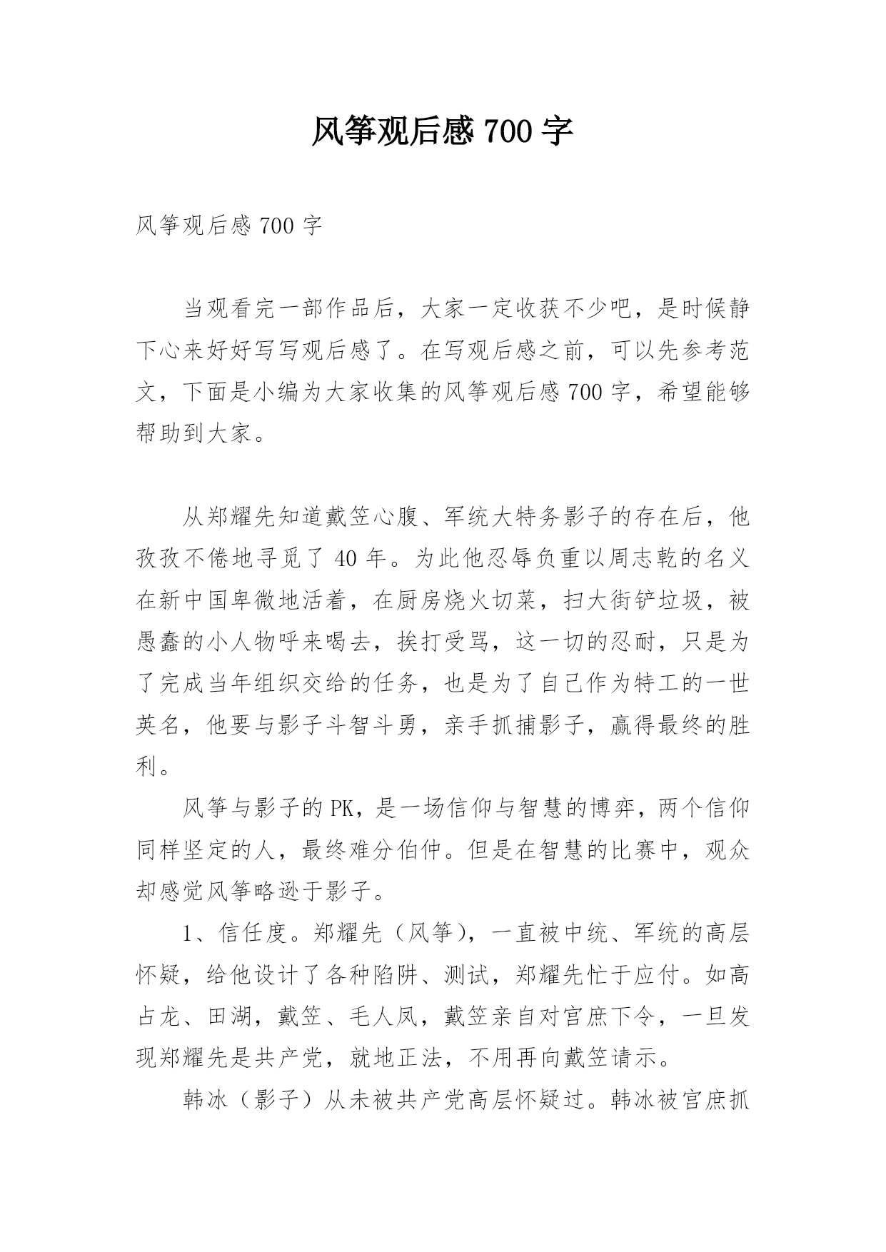 风筝观后感700字风筝观后感700字当观看完一部作品后,大家一定收获不少吧,是时候静下心来好好写写观后感了。在写观后感之前,可以先参考范文,下面是小编为大家收集的风筝观后感700字,希望能够帮助到大家。从郑耀先知道戴笠心腹、军统大特务影子的存在后,他孜孜不倦地寻觅了40年。为此他忍辱负重以周志乾的名义在新中国卑微地活着,在厨房烧火切菜,扫大街铲垃圾,被愚蠢的小人物呼来喝去,挨打受骂,这一切的忍耐,只是为了完成当年组织交给的任务,也是为了自己作为特工的一世英名,他要与影子斗智斗勇,亲手抓捕影子,赢得最终的胜