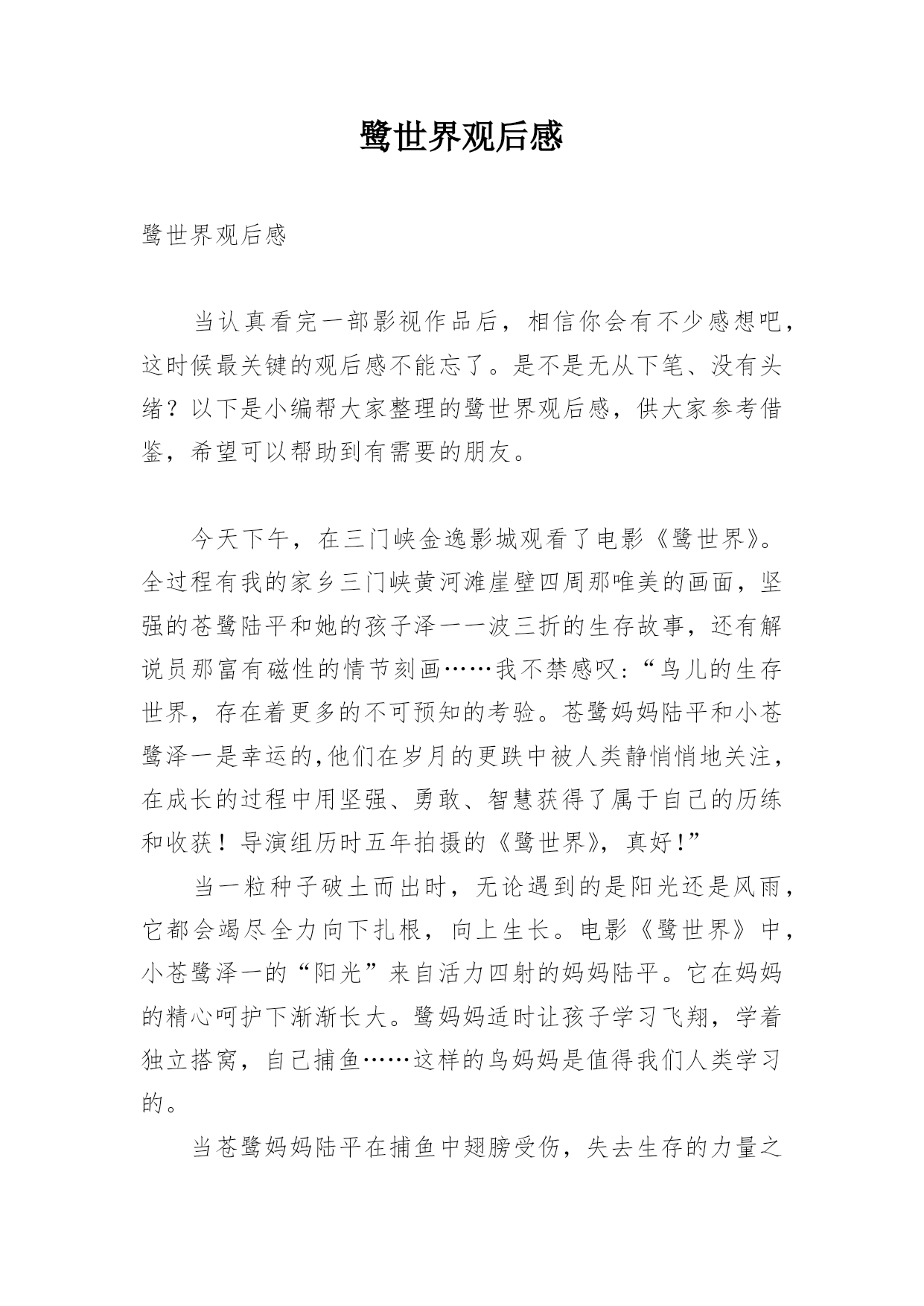 鹭世界观后感鹭世界观后感当认真看完一部影视作品后,相信你会有不少感想吧,这时候最关键的观后感不能忘了。是不是无从下笔、没有头绪?以下是小编帮大家整理的鹭世界观后感,供大家参考借鉴,希望可以帮助到有需要的朋友。今天下午,在三门峡金逸影城观看了电影《鹭世界》。全过程有我的家乡三门峡黄河滩崖壁四周那唯美的画面,坚强的苍鹭陆平和她的孩子泽一一波三折的生存故事,还有解说员那富有磁性的情节刻画……我不禁感叹:“鸟儿的生存世界,存在着更多的不可预知的考验。苍鹭妈妈陆平和小苍鹭泽一是幸运的,他们在岁月的更跌中被人类静悄悄
