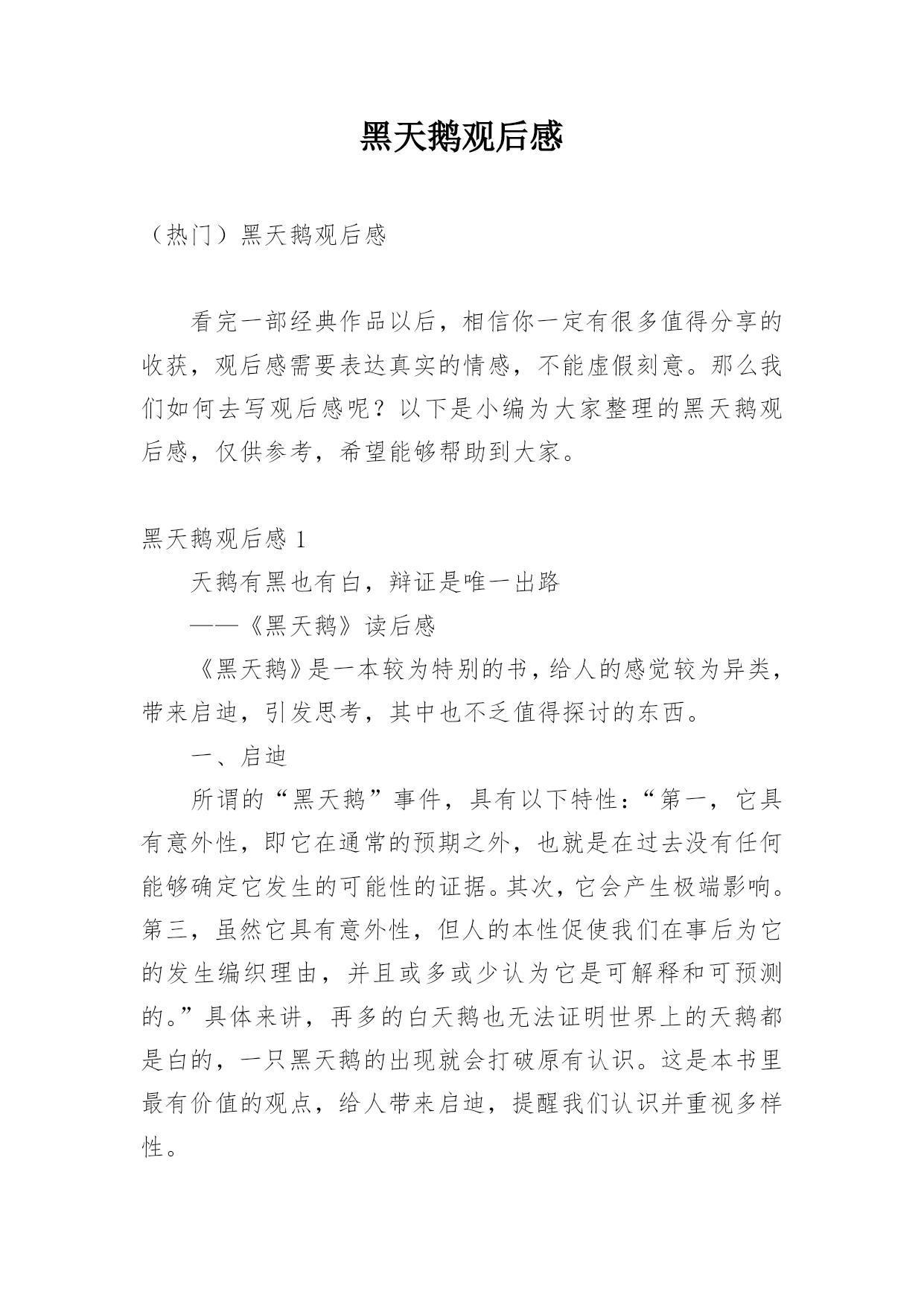 黑天鹅观后感(热门)黑天鹅观后感看完一部经典作品以后,相信你一定有很多值得分享的收获,观后感需要表达真实的情感,不能虚假刻意。那么我们如何去写观后感呢?以下是小编为大家整理的黑天鹅观后感,仅供参考,希望能够帮助到大家。黑天鹅观后感1天鹅有黑也有白,辩证是唯一出路——《黑天鹅》读后感《黑天鹅》是一本较为特别的书,给人的感觉较为异类,带来启迪,引发思考,其中也不乏值得探讨的东西。一、启迪所谓的“黑天鹅”事件,具有以下特性:“第一,它具有意外性,即它在通常的预期之外,也就是在过去没有任何能够确定它发生的可能性的