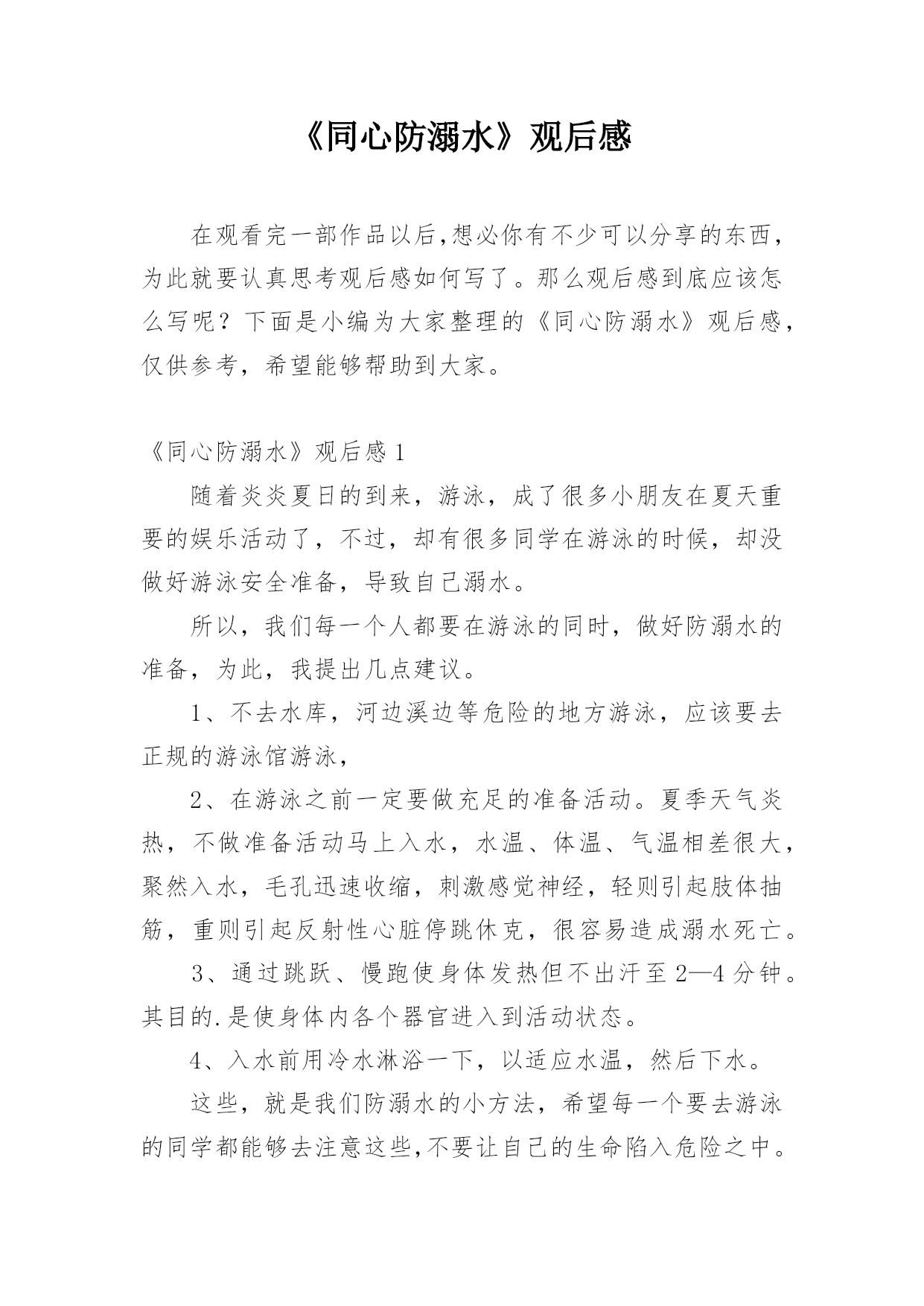《同心防溺水》观后感在观看完一部作品以后,想必你有不少可以分享的东西,为此就要认真思考观后感如何写了。那么观后感到底应该怎么写呢?下面是小编为大家整理的《同心防溺水》观后感,仅供参考,希望能够帮助到大家。《同心防溺水》观后感1随着炎炎夏日的到来,游泳,成了很多小朋友在夏天重要的娱乐活动了,不过,却有很多同学在游泳的时候,却没做好游泳安全准备,导致自己溺水。所以,我们每一个人都要在游泳的同时,做好防溺水的准备,为此,我提出几点建议。1、不去水库,河边溪边等危险的地方游泳,应该要去正规的游泳馆游泳,2、在游泳