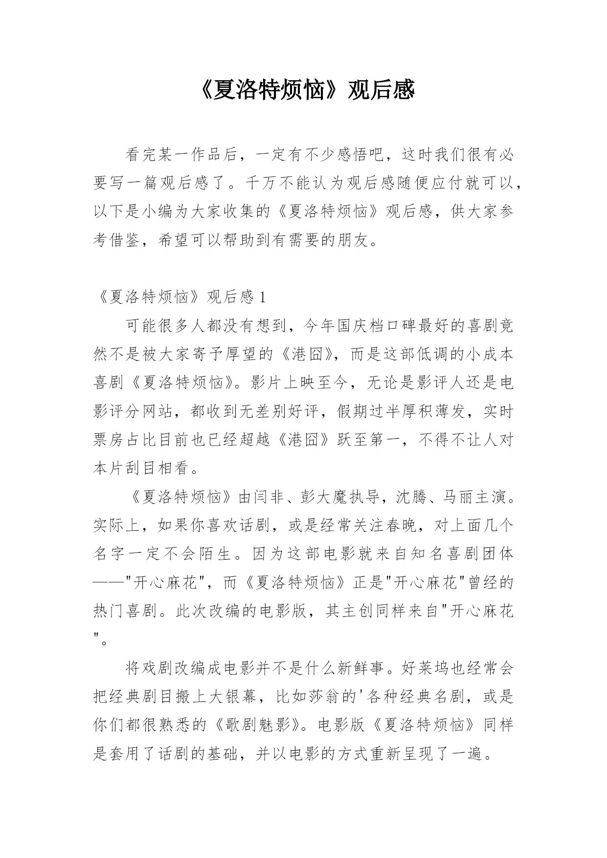 《夏洛特烦恼》观后感看完某一作品后,一定有不少感悟吧,这时我们很有必要写一篇观后感了。千万不能认为观后感随便应付就可以,以下是小编为大家收集的《夏洛特烦恼》观后感,供大家参考借鉴,希望可以帮助到有需要的朋友。《夏洛特烦恼》观后感1可能很多人都没有想到,今年国庆档口碑最好的喜剧竟然不是被大家寄予厚望的《港囧》,而是这部低调的小成本喜剧《夏洛特烦恼》。影片上映至今,无论是影评人还是电影评分网站,都收到无差别好评,假期过半厚积薄发,实时票房占比目前也已经超越《港囧》跃至第一,不得不让人对本片刮目相看。《夏洛特烦