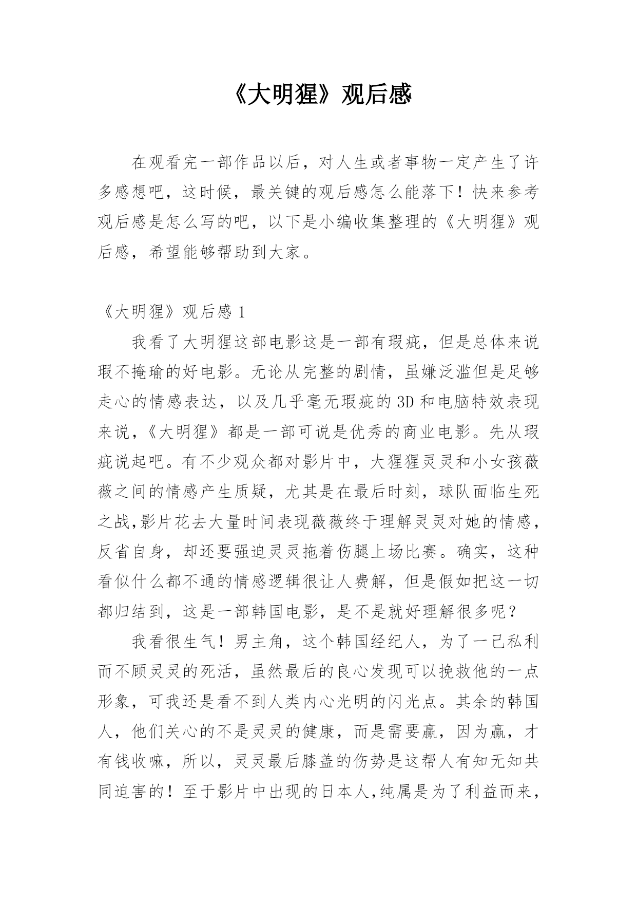 《大明猩》观后感在观看完一部作品以后,对人生或者事物一定产生了许多感想吧,这时候,最关键的观后感怎么能落下!快来参考观后感是怎么写的吧,以下是小编收集整理的《大明猩》观后感,希望能够帮助到大家。《大明猩》观后感1我看了大明猩这部电影这是一部有瑕疵,但是总体来说瑕不掩瑜的好电影。无论从完整的剧情,虽嫌泛滥但是足够走心的情感表达,以及几乎毫无瑕疵的3D和电脑特效表现来说,《大明猩》都是一部可说是优秀的商业电影。先从瑕疵说起吧。有不少观众都对影片中,大猩猩灵灵和小女孩薇薇之间的情感产生质疑,尤其是在最后时刻,球