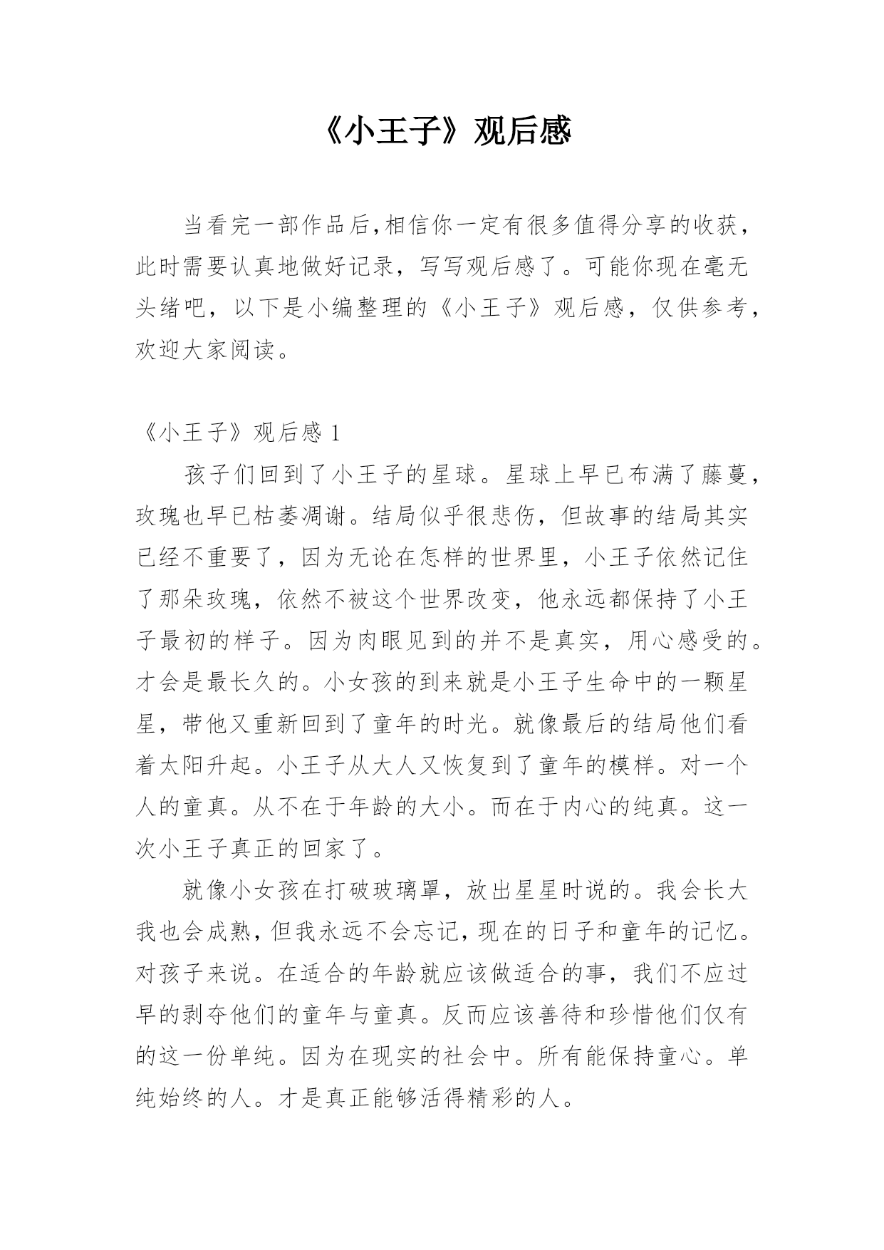 《小王子》观后感当看完一部作品后,相信你一定有很多值得分享的收获,此时需要认真地做好记录,写写观后感了。可能你现在毫无头绪吧,以下是小编整理的《小王子》观后感,仅供参考,欢迎大家阅读。《小王子》观后感1孩子们回到了小王子的星球。星球上早已布满了藤蔓,玫瑰也早已枯萎凋谢。结局似乎很悲伤,但故事的结局其实已经不重要了,因为无论在怎样的世界里,小王子依然记住了那朵玫瑰,依然不被这个世界改变,他永远都保持了小王子最初的样子。因为肉眼见到的并不是真实,用心感受的。才会是最长久的。小女孩的到来就是小王子生命中的一颗星