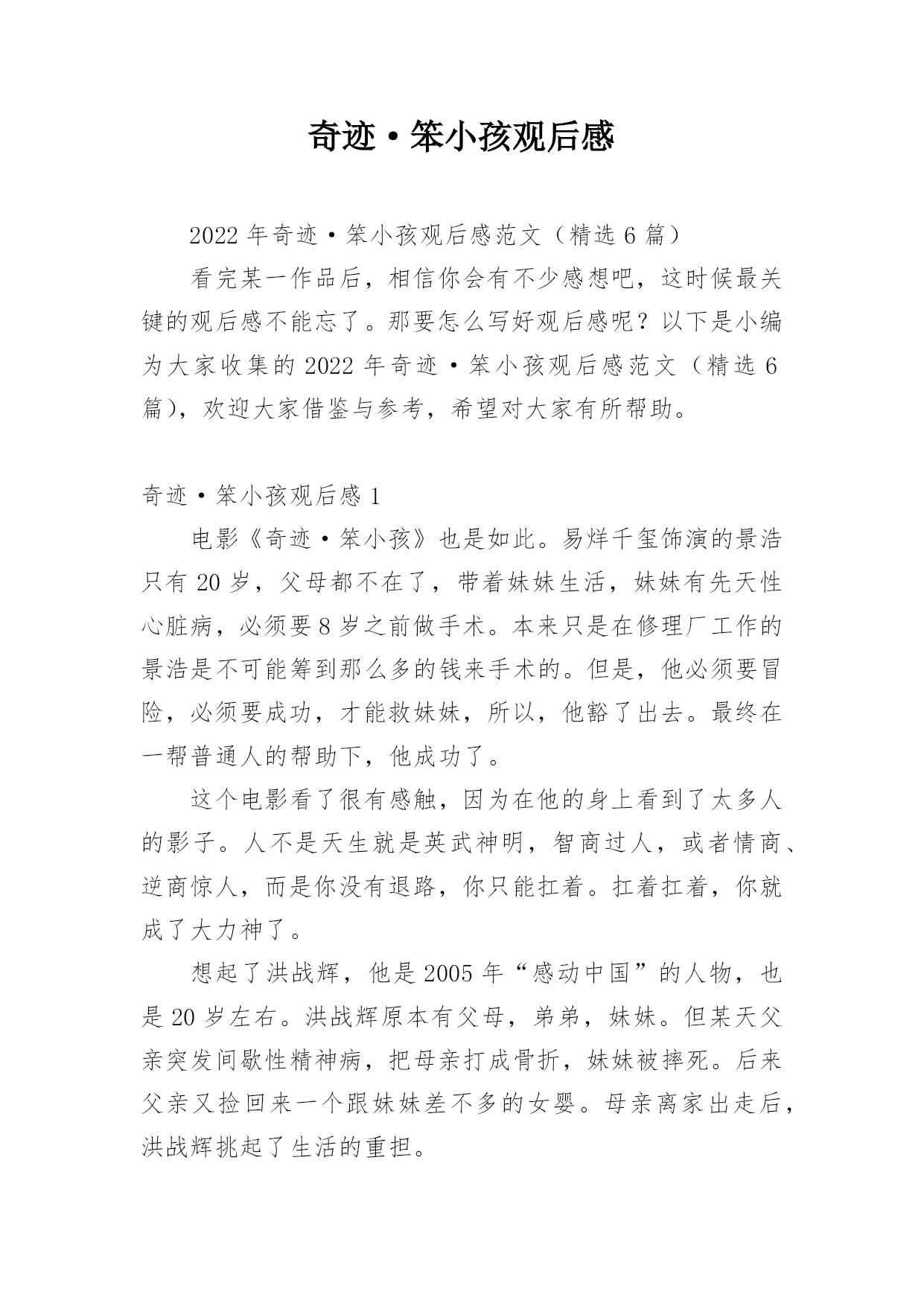 奇迹·笨小孩观后感2022年奇迹·笨小孩观后感范文(精选6篇)看完某一作品后,相信你会有不少感想吧,这时候最关键的观后感不能忘了。那要怎么写好观后感呢?以下是小编为大家收集的2022年奇迹·笨小孩观后感范文(精选6篇),欢迎大家借鉴与参考,希望对大家有所帮助。奇迹·笨小孩观后感1电影《奇迹·笨小孩》也是如此。易烊千玺饰演的景浩只有20岁,父母都不在了,带着妹妹生活,妹妹有先天性心脏病,必须要8岁之前做手术。本来只是在修理厂工作的景浩是不可能筹到那么多的钱来手术的。但是,他必须要冒险,必须要成功,才能救妹妹