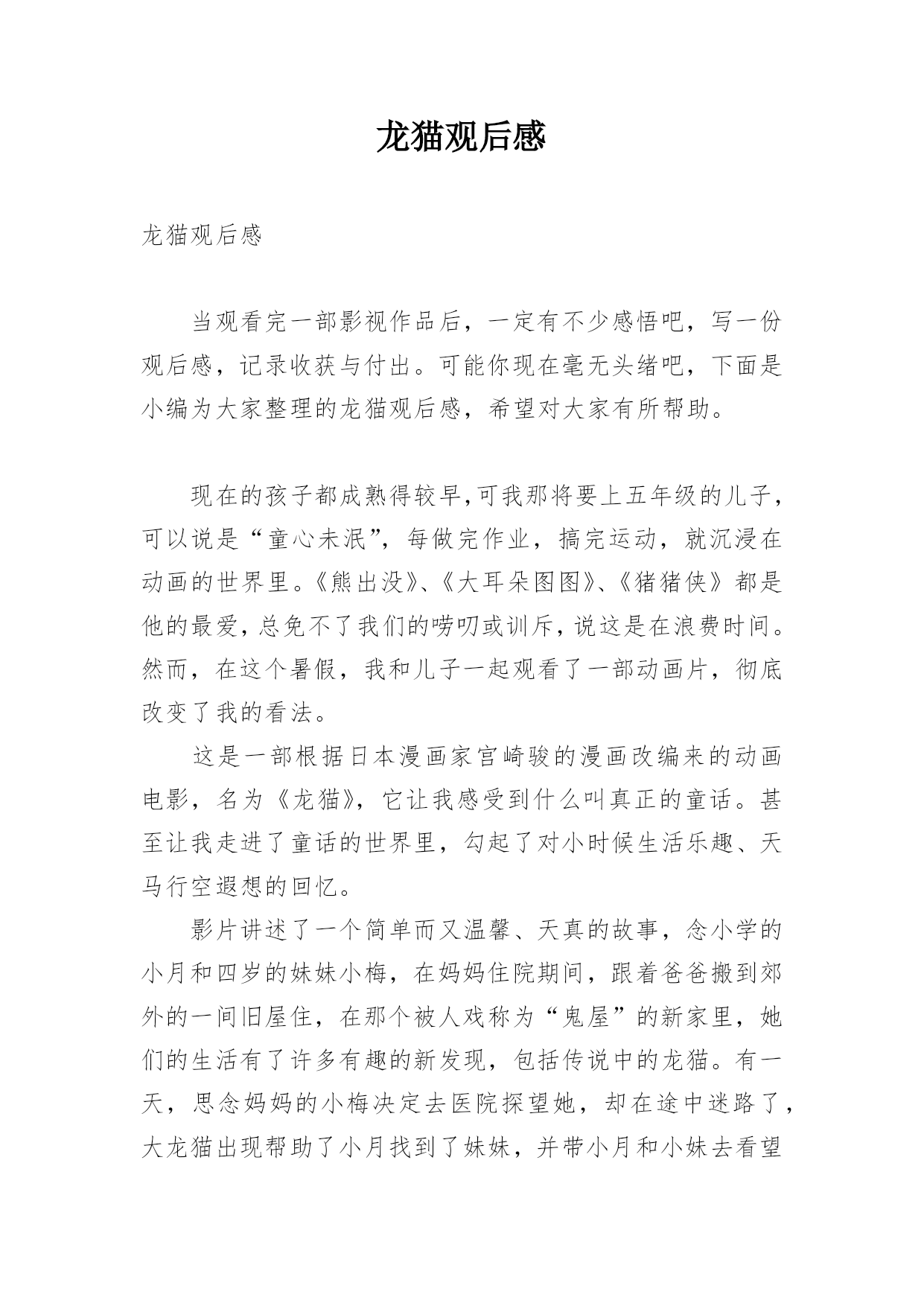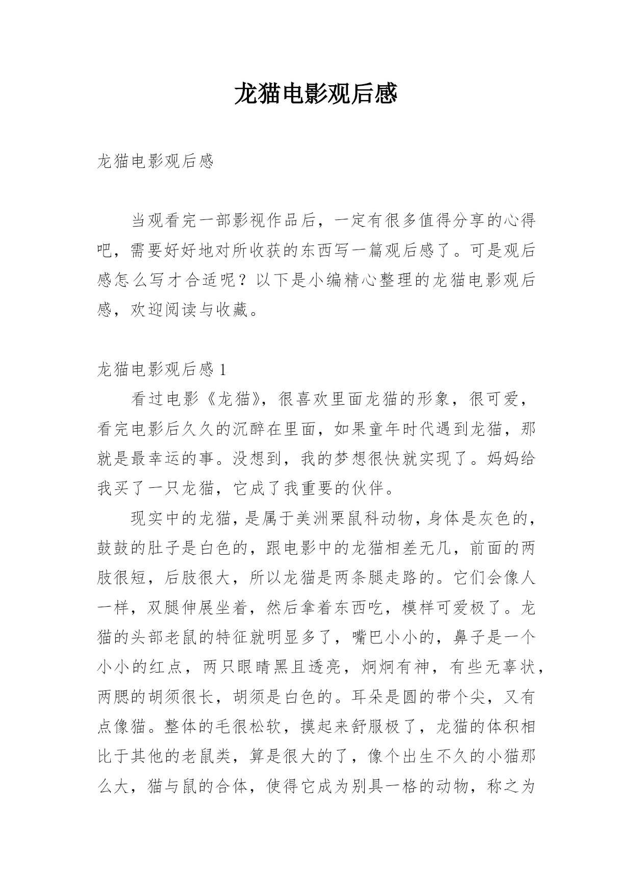 龙猫电影观后感龙猫电影观后感当观看完一部影视作品后,一定有很多值得分享的心得吧,需要好好地对所收获的东西写一篇观后感了。可是观后感怎么写才合适呢?以下是小编精心整理的龙猫电影观后感,欢迎阅读与收藏。龙猫电影观后感1看过电影《龙猫》,很喜欢里面龙猫的形象,很可爱,看完电影后久久的沉醉在里面,如果童年时代遇到龙猫,那就是最幸运的事。没想到,我的梦想很快就实现了。妈妈给我买了一只龙猫,它成了我重要的伙伴。现实中的龙猫,是属于美洲栗鼠科动物,身体是灰色的,鼓鼓的肚子是白色的,跟电影中的龙猫相差无几,前面的两肢很短