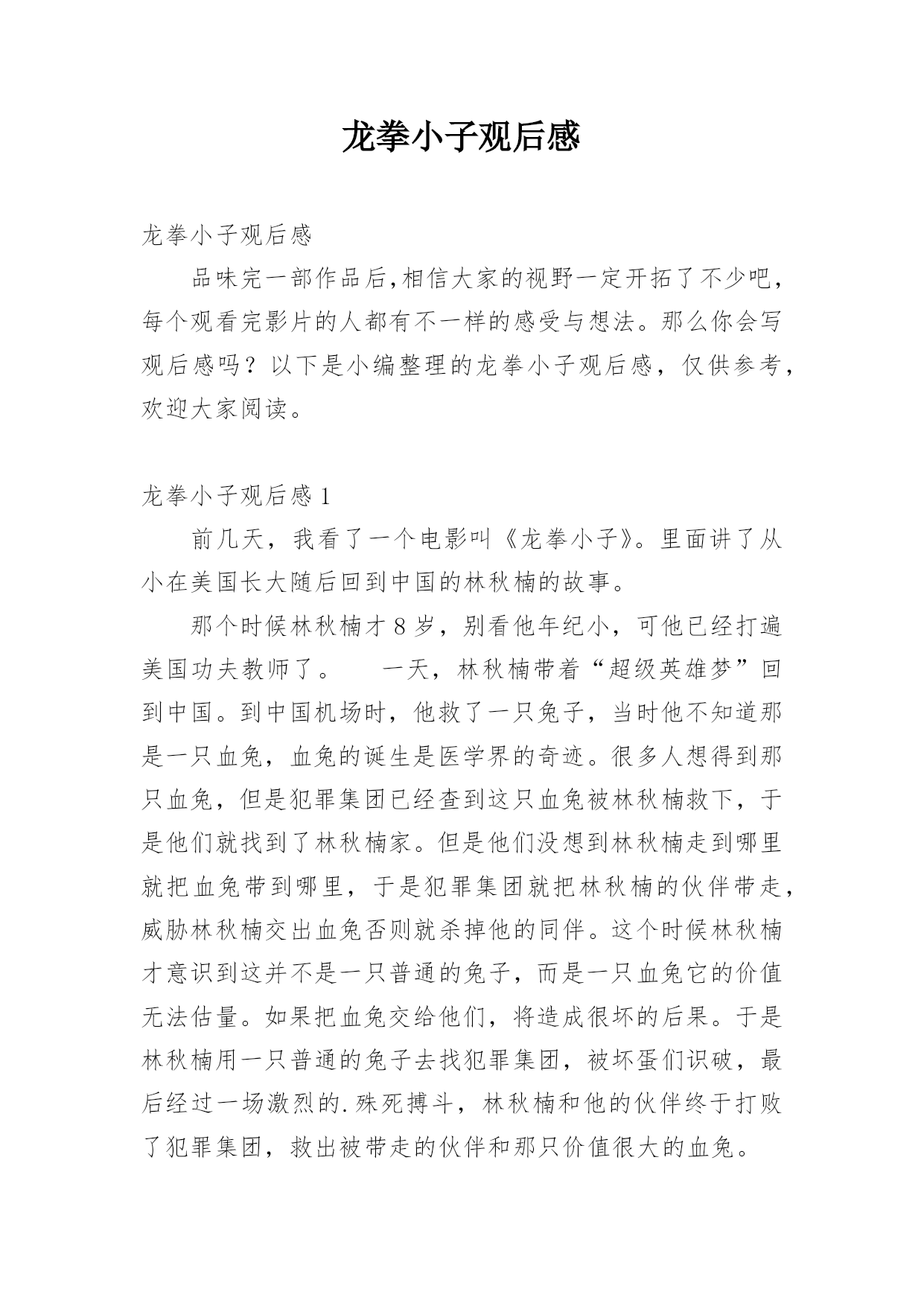龙拳小子观后感龙拳小子观后感品味完一部作品后,相信大家的视野一定开拓了不少吧,每个观看完影片的人都有不一样的感受与想法。那么你会写观后感吗?以下是小编整理的龙拳小子观后感,仅供参考,欢迎大家阅读。龙拳小子观后感1前几天,我看了一个电影叫《龙拳小子》。里面讲了从小在美国长大随后回到中国的林秋楠的故事。那个时候林秋楠才8岁,别看他年纪小,可他已经打遍美国功夫教师了。一天,林秋楠带着“超级英雄梦”回到中国。到中国机场时,他救了一只兔子,当时他不知道那是一只血兔,血兔的诞生是医学界的奇迹。很多人想得到那只血兔,但