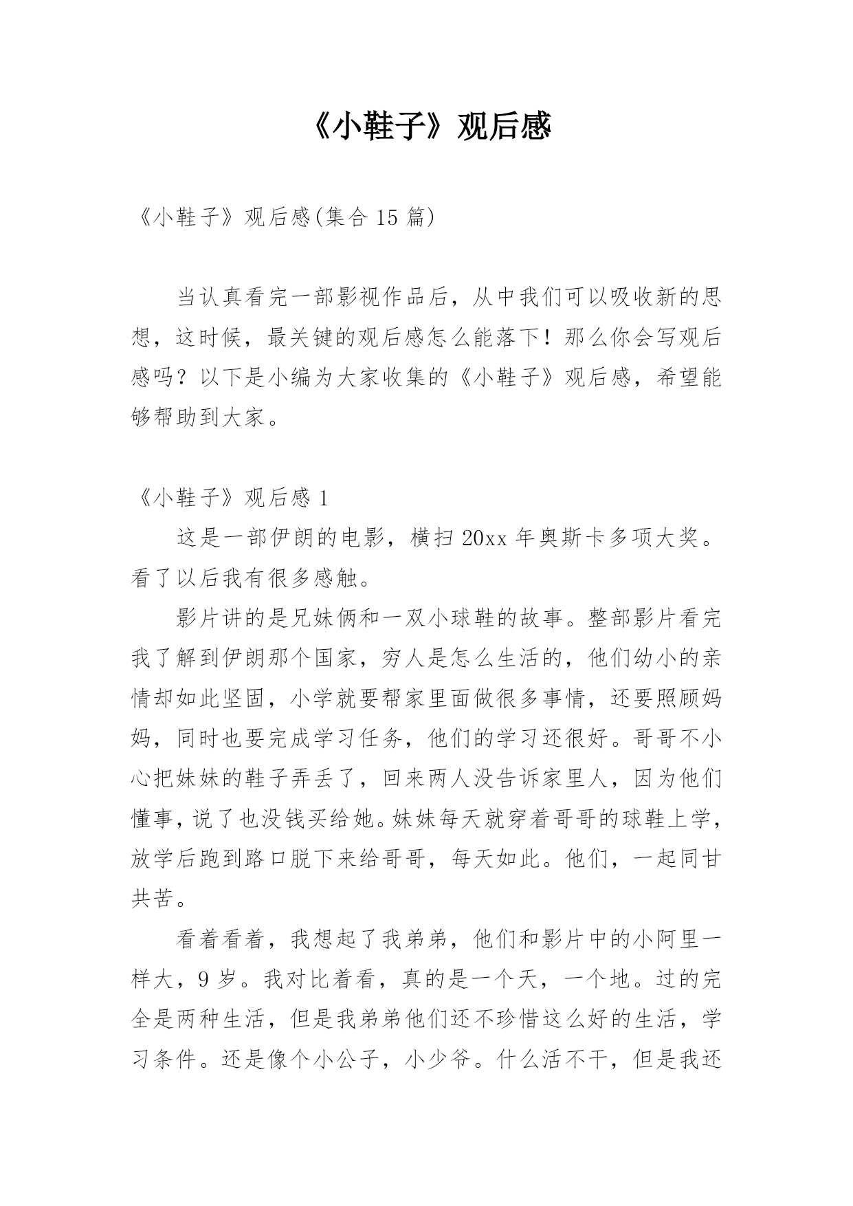 《小鞋子》观后感《小鞋子》观后感(集合15篇)当认真看完一部影视作品后,从中我们可以吸收新的思想,这时候,最关键的观后感怎么能落下!那么你会写观后感吗?以下是小编为大家收集的《小鞋子》观后感,希望能够帮助到大家。《小鞋子》观后感1这是一部伊朗的电影,横扫20xx年奥斯卡多项大奖。看了以后我有很多感触。影片讲的是兄妹俩和一双小球鞋的故事。整部影片看完我了解到伊朗那个国家,穷人是怎么生活的,他们幼小的亲情却如此坚固,小学就要帮家里面做很多事情,还要照顾妈妈,同时也要完成学习任务,他们的学习还很好。哥哥不小心把