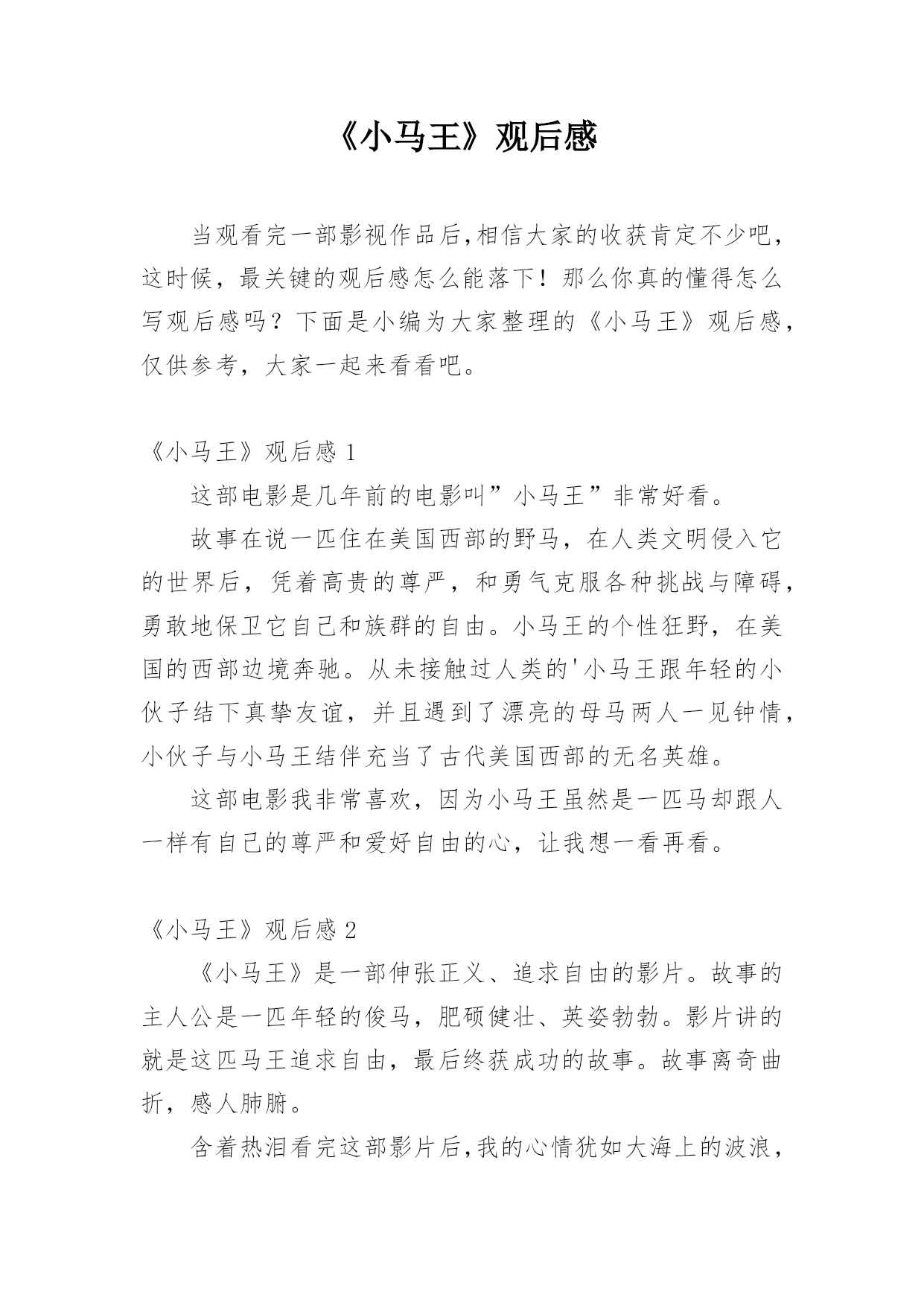 《小马王》观后感当观看完一部影视作品后,相信大家的收获肯定不少吧,这时候,最关键的观后感怎么能落下!那么你真的懂得怎么写观后感吗?下面是小编为大家整理的《小马王》观后感,仅供参考,大家一起来看看吧。《小马王》观后感1这部电影是几年前的电影叫”小马王”非常好看。故事在说一匹住在美国西部的野马,在人类文明侵入它的世界后,凭着高贵的尊严,和勇气克服各种挑战与障碍,勇敢地保卫它自己和族群的自由。小马王的个性狂野,在美国的西部边境奔驰。从未接触过人类的'小马王跟年轻的小伙子结下真挚友谊,并且遇到了漂亮的母马两人一见