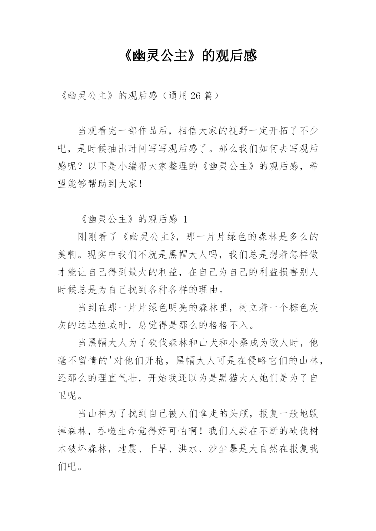 《幽灵公主》的观后感《幽灵公主》的观后感(通用26篇)当观看完一部作品后,相信大家的视野一定开拓了不少吧,是时候抽出时间写写观后感了。那么我们如何去写观后感呢?以下是小编帮大家整理的《幽灵公主》的观后感,希望能够帮助到大家!《幽灵公主》的观后感1刚刚看了《幽灵公主》,那一片片绿色的森林是多么的美啊。现实中我们不就是黑帽大人吗,我们总是想着怎样做才能让自己得到最大的利益,在自己为自己的利益损害别人时候总是为自己找到各种各样的理由。当到在那一片片绿色明亮的森林里,树立着一个棕色灰灰的达达拉城时,总觉得是那么的