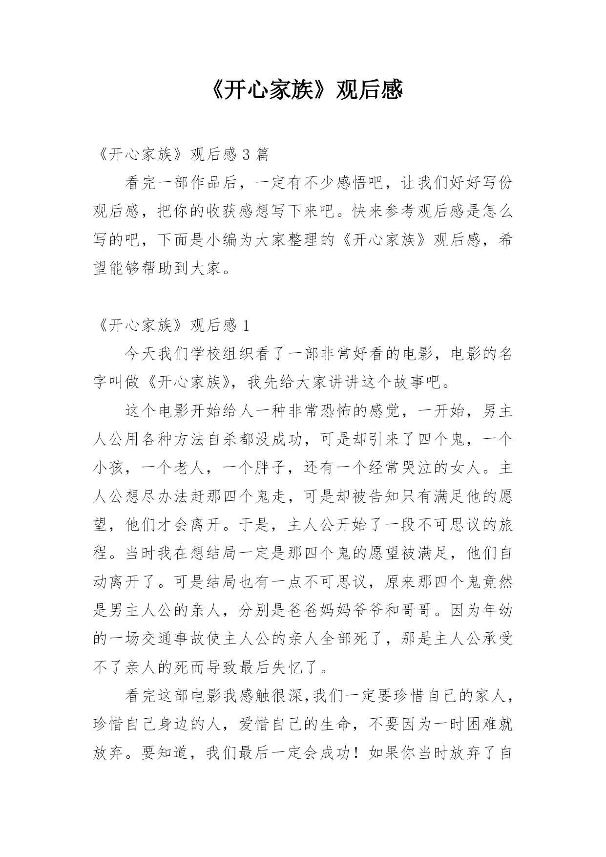 《开心家族》观后感《开心家族》观后感3篇看完一部作品后,一定有不少感悟吧,让我们好好写份观后感,把你的收获感想写下来吧。快来参考观后感是怎么写的吧,下面是小编为大家整理的《开心家族》观后感,希望能够帮助到大家。《开心家族》观后感1今天我们学校组织看了一部非常好看的电影,电影的名字叫做《开心家族》,我先给大家讲讲这个故事吧。这个电影开始给人一种非常恐怖的感觉,一开始,男主人公用各种方法自杀都没成功,可是却引来了四个鬼,一个小孩,一个老人,一个胖子,还有一个经常哭泣的女人。主人公想尽办法赶那四个鬼走,可是却被