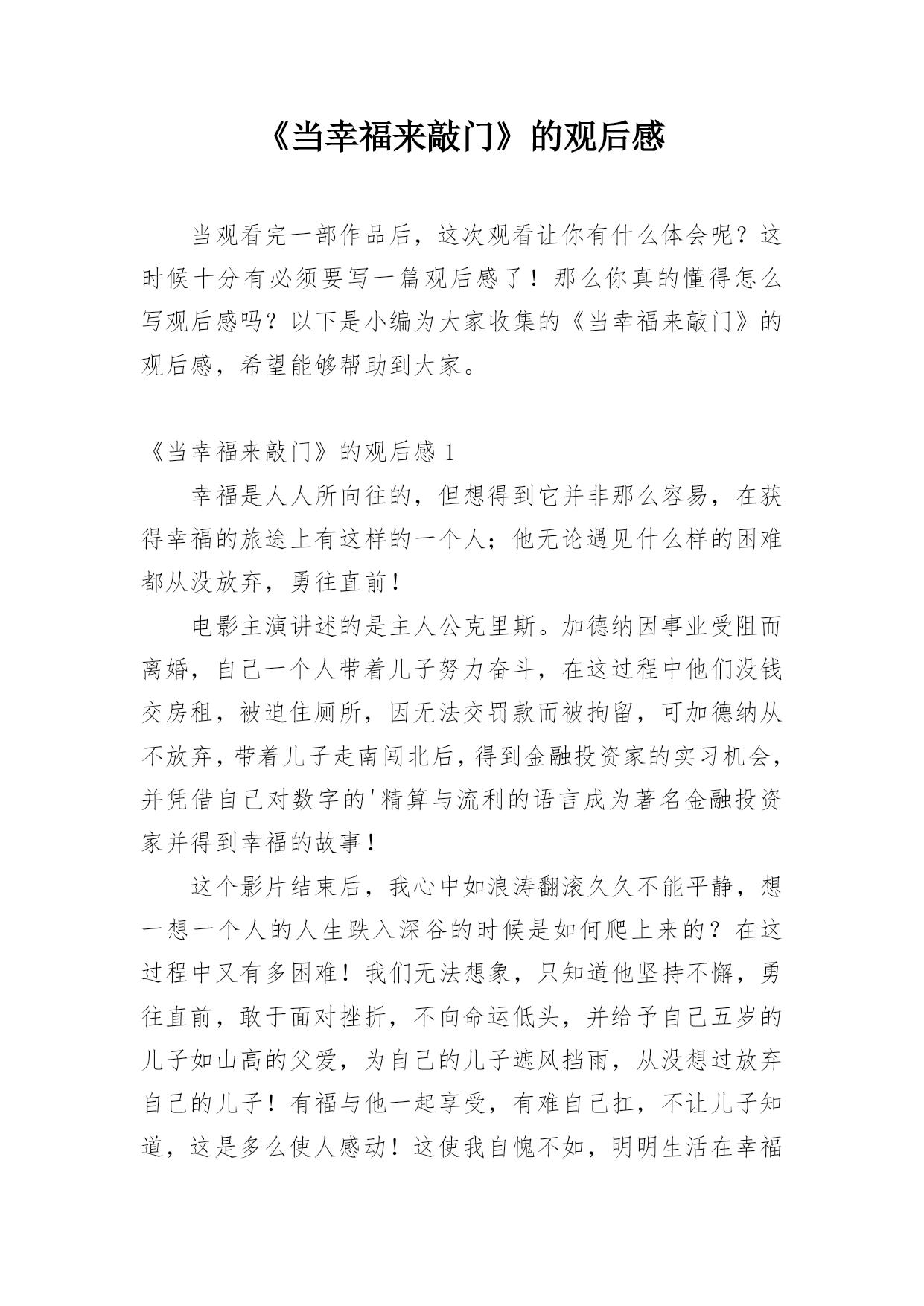 《当幸福来敲门》的观后感当观看完一部作品后,这次观看让你有什么体会呢?这时候十分有必须要写一篇观后感了!那么你真的懂得怎么写观后感吗?以下是小编为大家收集的《当幸福来敲门》的观后感,希望能够帮助到大家。《当幸福来敲门》的观后感1幸福是人人所向往的,但想得到它并非那么容易,在获得幸福的旅途上有这样的一个人;他无论遇见什么样的困难都从没放弃,勇往直前!电影主演讲述的是主人公克里斯。加德纳因事业受阻而离婚,自己一个人带着儿子努力奋斗,在这过程中他们没钱交房租,被迫住厕所,因无法交罚款而被拘留,可加德纳从不放弃,