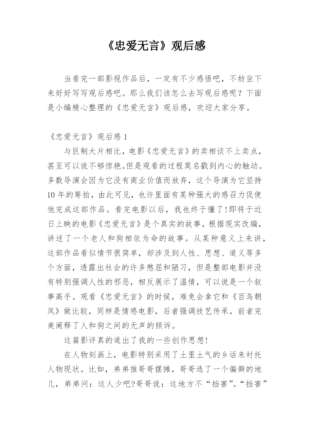 《忠爱无言》观后感当看完一部影视作品后,一定有不少感悟吧,不妨坐下来好好写写观后感吧。那么我们该怎么去写观后感呢?下面是小编精心整理的《忠爱无言》观后感,欢迎大家分享。《忠爱无言》观后感1与巨制大片相比,电影《忠爱无言》的卖相谈不上卖点,甚至可以说不够惊艳。但是观看的过程莫名戳到内心的触动。多数导演会因为它没有商业价值而放弃,这个导演为它坚持10年的筹拍,由此可见,也许里面有某种强大的感召力促使他完成这部作品。看完电影以后,我也终于懂了!即将于近日上映的电影《忠爱无言》是个真实的故事,根据现实改编,讲述了