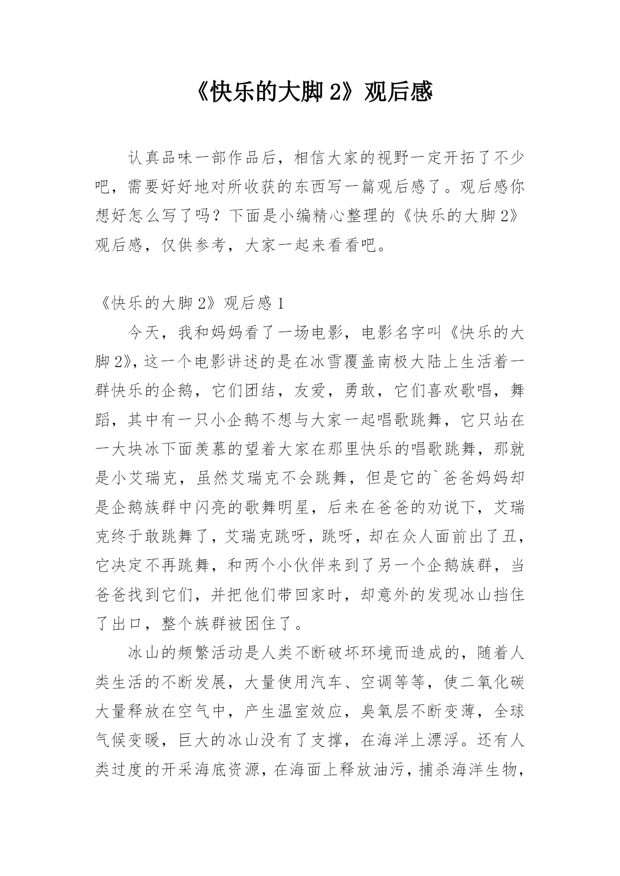 《快乐的大脚2》观后感认真品味一部作品后,相信大家的视野一定开拓了不少吧,需要好好地对所收获的东西写一篇观后感了。观后感你想好怎么写了吗?下面是小编精心整理的《快乐的大脚2》观后感,仅供参考,大家一起来看看吧。《快乐的大脚2》观后感1今天,我和妈妈看了一场电影,电影名字叫《快乐的大脚2》,这一个电影讲述的是在冰雪覆盖南极大陆上生活着一群快乐的企鹅,它们团结,友爱,勇敢,它们喜欢歌唱,舞蹈,其中有一只小企鹅不想与大家一起唱歌跳舞,它只站在一大块冰下面羡慕的望着大家在那里快乐的唱歌跳舞,那就是小艾瑞克,虽然艾