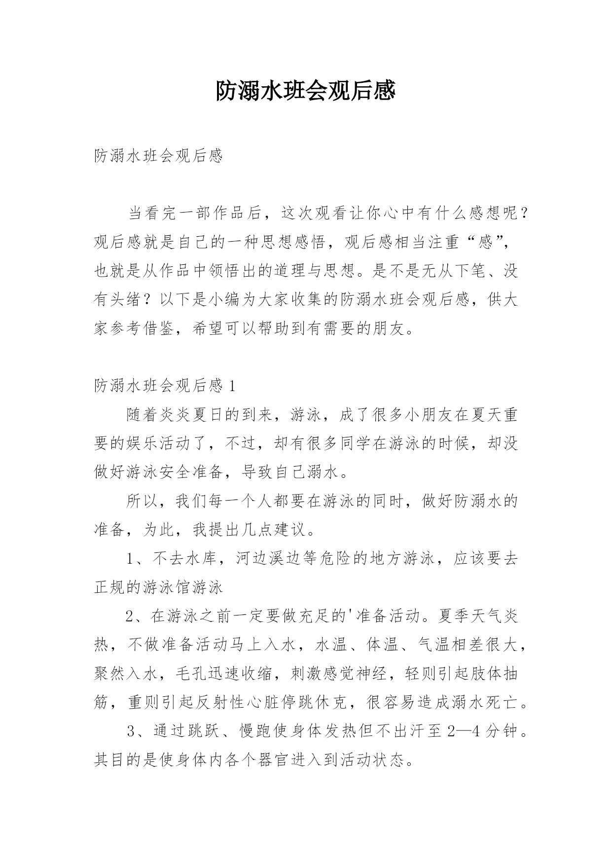防溺水班会观后感防溺水班会观后感当看完一部作品后,这次观看让你心中有什么感想呢?观后感就是自己的一种思想感悟,观后感相当注重“感”,也就是从作品中领悟出的道理与思想。是不是无从下笔、没有头绪?以下是小编为大家收集的防溺水班会观后感,供大家参考借鉴,希望可以帮助到有需要的朋友。防溺水班会观后感1随着炎炎夏日的到来,游泳,成了很多小朋友在夏天重要的娱乐活动了,不过,却有很多同学在游泳的时候,却没做好游泳安全准备,导致自己溺水。所以,我们每一个人都要在游泳的同时,做好防溺水的准备,为此,我提出几点建议。1、不去