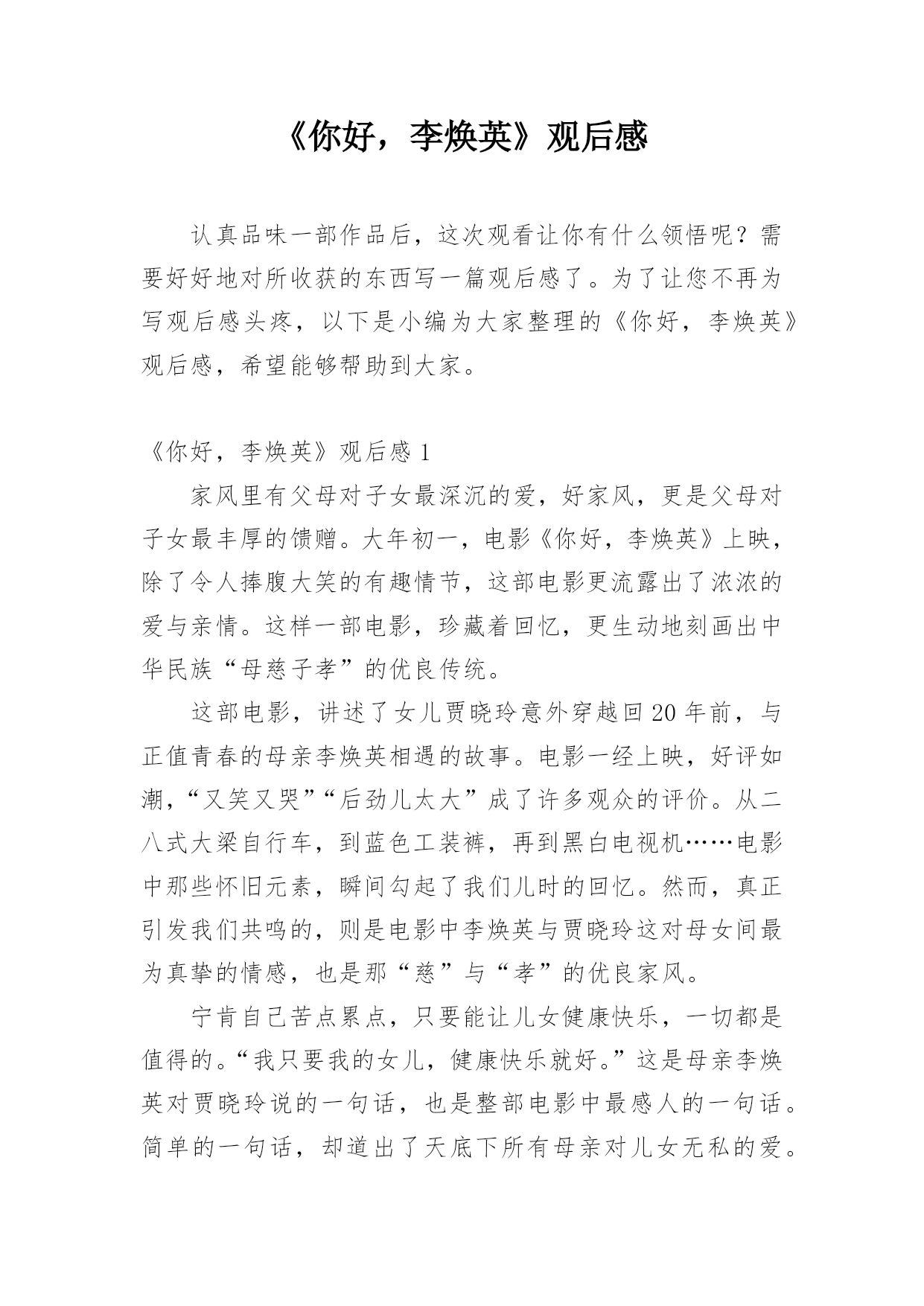 《你好,李焕英》观后感认真品味一部作品后,这次观看让你有什么领悟呢?需要好好地对所收获的东西写一篇观后感了。为了让您不再为写观后感头疼,以下是小编为大家整理的《你好,李焕英》观后感,希望能够帮助到大家。《你好,李焕英》观后感1家风里有父母对子女最深沉的爱,好家风,更是父母对子女最丰厚的馈赠。大年初一,电影《你好,李焕英》上映,除了令人捧腹大笑的有趣情节,这部电影更流露出了浓浓的爱与亲情。这样一部电影,珍藏着回忆,更生动地刻画出中华民族“母慈子孝”的优良传统。这部电影,讲述了女儿贾晓玲意外穿越回20年前,与