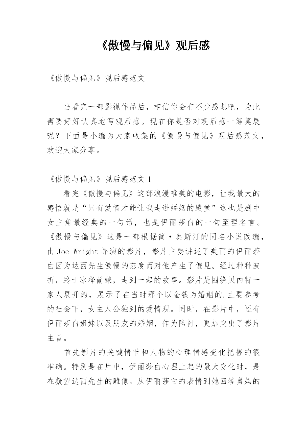 《傲慢与偏见》观后感《傲慢与偏见》观后感范文当看完一部影视作品后,相信你会有不少感想吧,为此需要好好认真地写观后感。现在你是否对观后感一筹莫展呢?下面是小编为大家收集的《傲慢与偏见》观后感范文,欢迎大家分享。《傲慢与偏见》观后感范文1看完《傲慢与偏见》这部浪漫唯美的电影,让我最大的感悟就是“只有爱情才能让我走进婚姻的殿堂”这也是剧中女主角最经典的一句话,也是伊丽莎白的一句至理名言。《傲慢与偏见》这是一部根据简·奥斯汀的同名小说改编,由JoeWright导演的影片,影片主要讲述了美丽的伊丽莎白因为达西先生傲