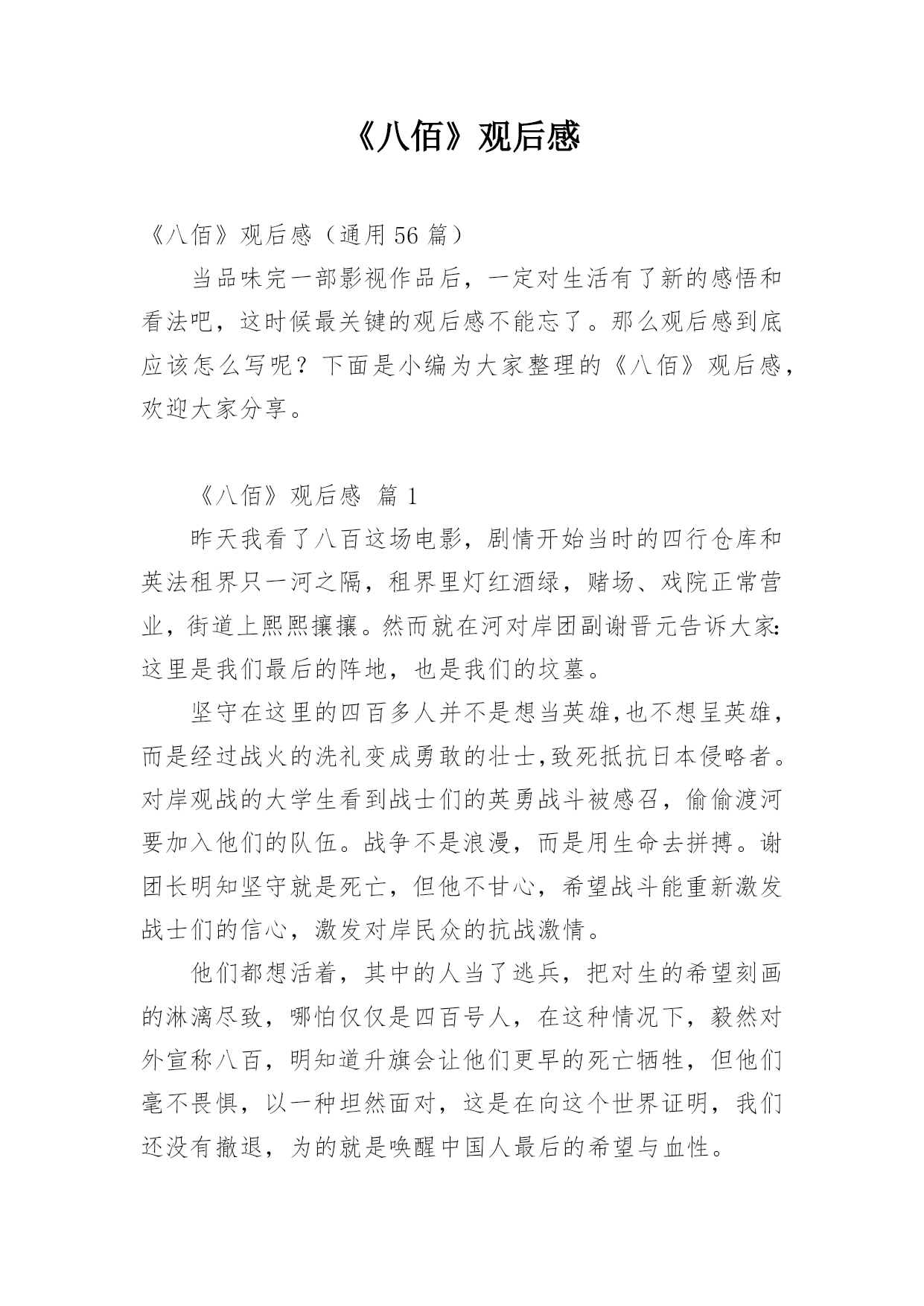 《八佰》观后感《八佰》观后感(通用56篇)当品味完一部影视作品后,一定对生活有了新的感悟和看法吧,这时候最关键的观后感不能忘了。那么观后感到底应该怎么写呢?下面是小编为大家整理的《八佰》观后感,欢迎大家分享。《八佰》观后感篇1昨天我看了八百这场电影,剧情开始当时的四行仓库和英法租界只一河之隔,租界里灯红酒绿,赌场、戏院正常营业,街道上熙熙攘攘。然而就在河对岸团副谢晋元告诉大家:这里是我们最后的阵地,也是我们的坟墓。坚守在这里的四百多人并不是想当英雄,也不想呈英雄,而是经过战火的洗礼变成勇敢的壮士,致死抵抗