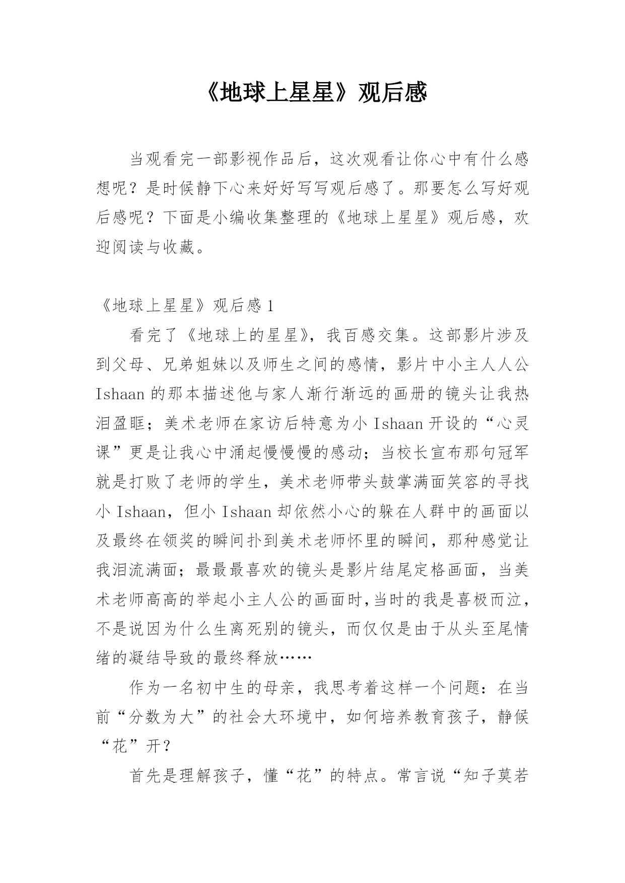 《地球上星星》观后感当观看完一部影视作品后,这次观看让你心中有什么感想呢?是时候静下心来好好写写观后感了。那要怎么写好观后感呢?下面是小编收集整理的《地球上星星》观后感,欢迎阅读与收藏。《地球上星星》观后感1看完了《地球上的星星》,我百感交集。这部影片涉及到父母、兄弟姐妹以及师生之间的感情,影片中小主人人公Ishaan的那本描述他与家人渐行渐远的画册的镜头让我热泪盈眶;美术老师在家访后特意为小Ishaan开设的“心灵课”更是让我心中涌起慢慢慢的感动;当校长宣布那句冠军就是打败了老师的学生,美术老师带头鼓掌