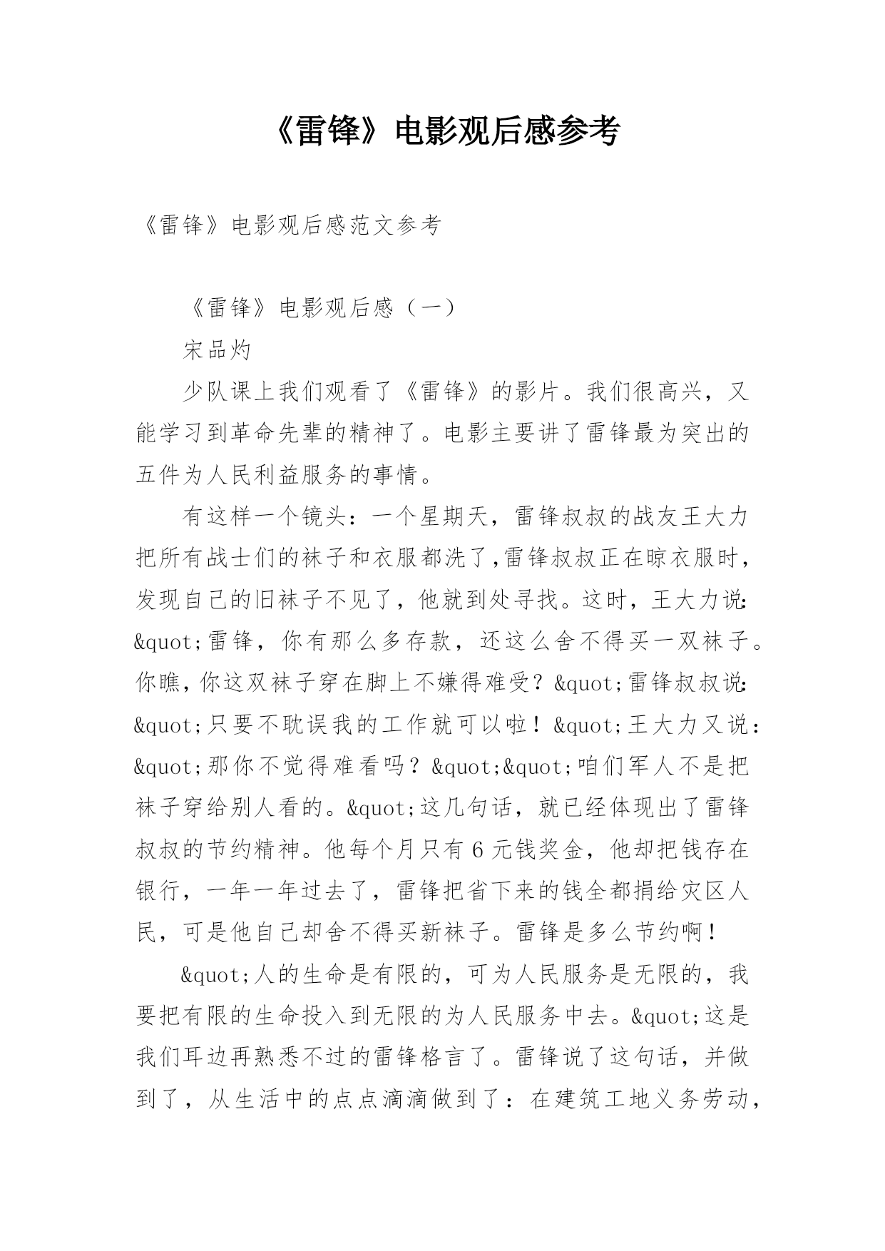 《雷锋》电影观后感参考《雷锋》电影观后感范文参考《雷锋》电影观后感(一)宋品灼少队课上我们观看了《雷锋》的影片。我们很高兴,又能学习到革命先辈的精神了。电影主要讲了雷锋最为突出的五件为人民利益服务的事情。有这样一个镜头:一个星期天,雷锋叔叔的战友王大力把所有战士们的袜子和衣服都洗了,雷锋叔叔正在晾衣服时,发现自己的旧袜子不见了,他就到处寻找。这时,王大力说:"雷锋,你有那么多存款,还这么舍不得买一双袜子。你瞧,你这双袜子穿在脚上不嫌得难受?"雷锋叔叔说:"只要不耽误我的工作就