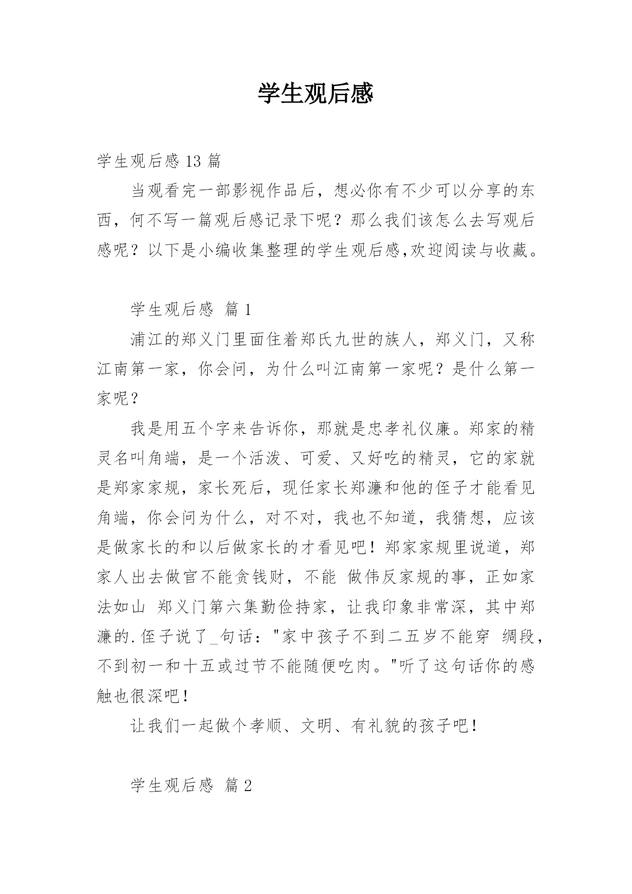 学生观后感学生观后感13篇当观看完一部影视作品后,想必你有不少可以分享的东西,何不写一篇观后感记录下呢?那么我们该怎么去写观后感呢?以下是小编收集整理的学生观后感,欢迎阅读与收藏。学生观后感篇1浦江的郑义门里面住着郑氏九世的族人,郑义门,又称江南第一家,你会问,为什么叫江南第一家呢?是什么第一家呢?我是用五个字来告诉你,那就是忠孝礼仪廉。郑家的精灵名叫角端,是一个活泼、可爱、又好吃的精灵,它的家就是郑家家规,家长死后,现任家长郑濂和他的侄子才能看见角端,你会问为什么,对不对,我也不知道,我猜想,应该是做家