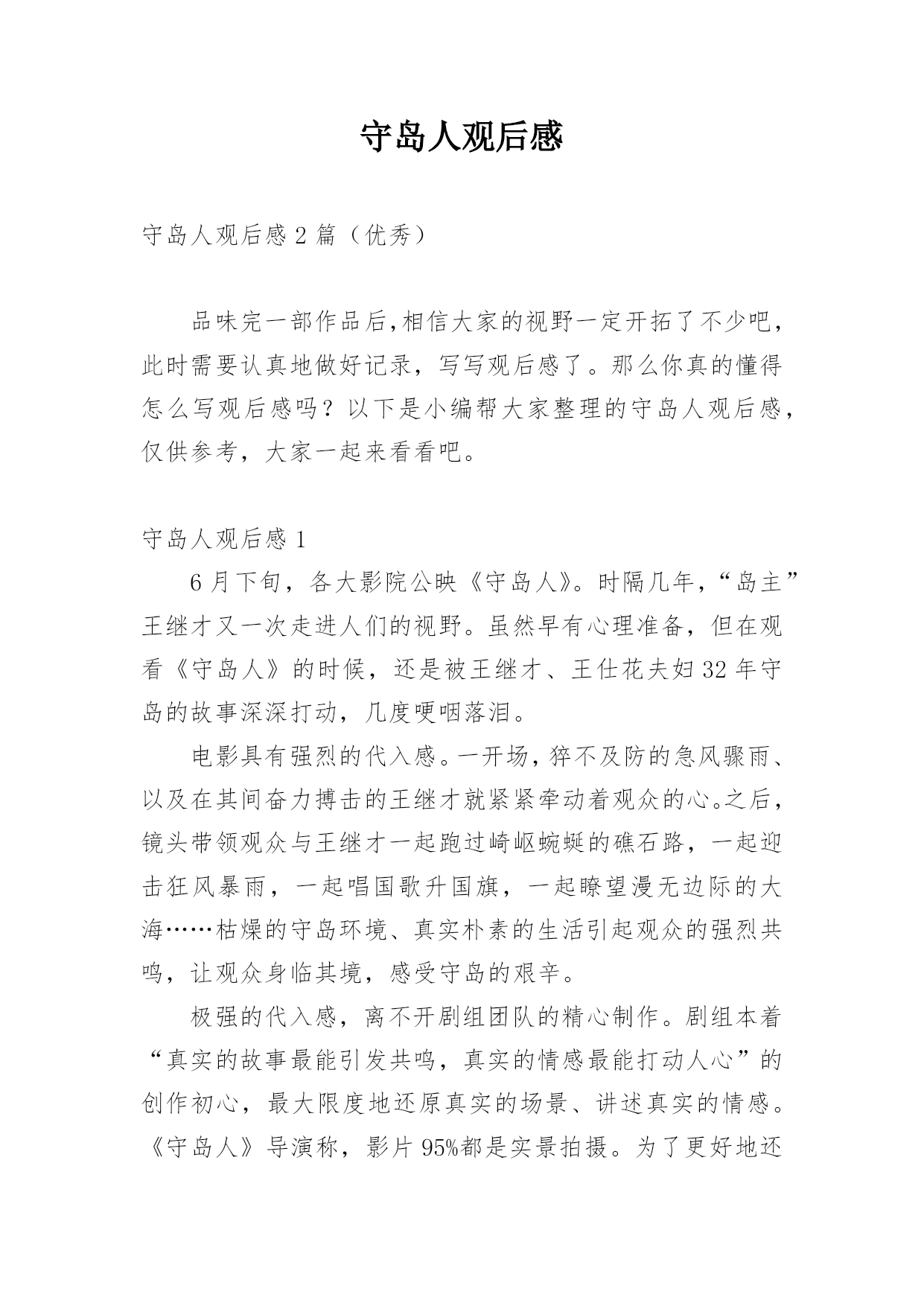 守岛人观后感守岛人观后感2篇(优秀)品味完一部作品后,相信大家的视野一定开拓了不少吧,此时需要认真地做好记录,写写观后感了。那么你真的懂得怎么写观后感吗?以下是小编帮大家整理的守岛人观后感,仅供参考,大家一起来看看吧。守岛人观后感16月下旬,各大影院公映《守岛人》。时隔几年,“岛主”王继才又一次走进人们的视野。虽然早有心理准备,但在观看《守岛人》的时候,还是被王继才、王仕花夫妇32年守岛的故事深深打动,几度哽咽落泪。电影具有强烈的代入感。一开场,猝不及防的急风骤雨、以及在其间奋力搏击的王继才就紧紧牵动着观