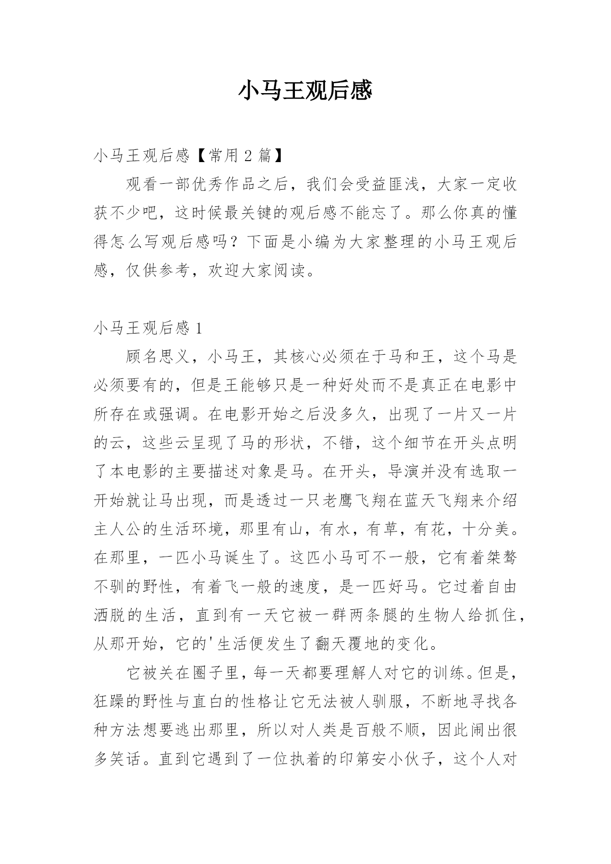 小马王观后感小马王观后感【常用2篇】观看一部优秀作品之后,我们会受益匪浅,大家一定收获不少吧,这时候最关键的观后感不能忘了。那么你真的懂得怎么写观后感吗?下面是小编为大家整理的小马王观后感,仅供参考,欢迎大家阅读。小马王观后感1顾名思义,小马王,其核心必须在于马和王,这个马是必须要有的,但是王能够只是一种好处而不是真正在电影中所存在或强调。在电影开始之后没多久,出现了一片又一片的云,这些云呈现了马的形状,不错,这个细节在开头点明了本电影的主要描述对象是马。在开头,导演并没有选取一开始就让马出现,而是透过一