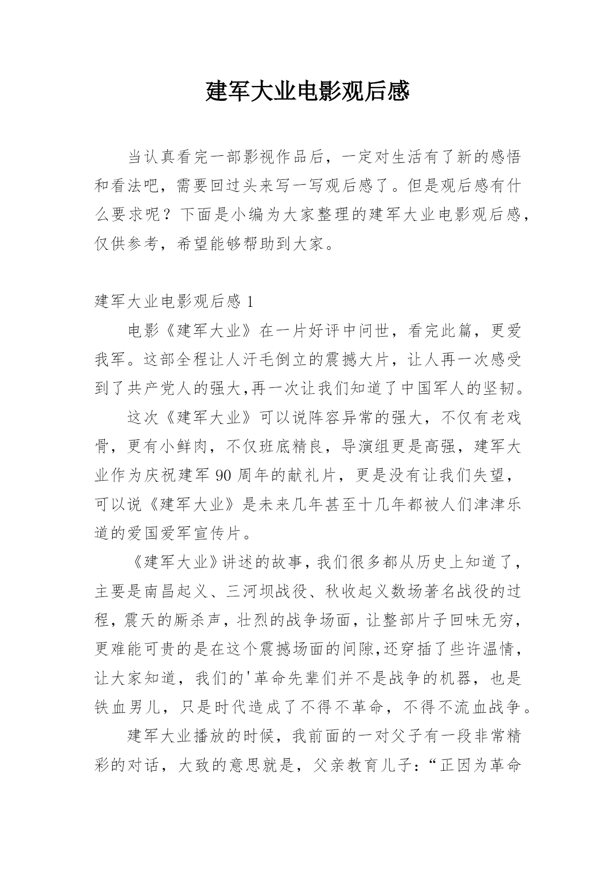建军大业电影观后感当认真看完一部影视作品后,一定对生活有了新的感悟和看法吧,需要回过头来写一写观后感了。但是观后感有什么要求呢?下面是小编为大家整理的建军大业电影观后感,仅供参考,希望能够帮助到大家。建军大业电影观后感1电影《建军大业》在一片好评中问世,看完此篇,更爱我军。这部全程让人汗毛倒立的震撼大片,让人再一次感受到了共产党人的强大,再一次让我们知道了中国军人的坚韧。这次《建军大业》可以说阵容异常的强大,不仅有老戏骨,更有小鲜肉,不仅班底精良,导演组更是高强,建军大业作为庆祝建军90周年的献礼片,更是