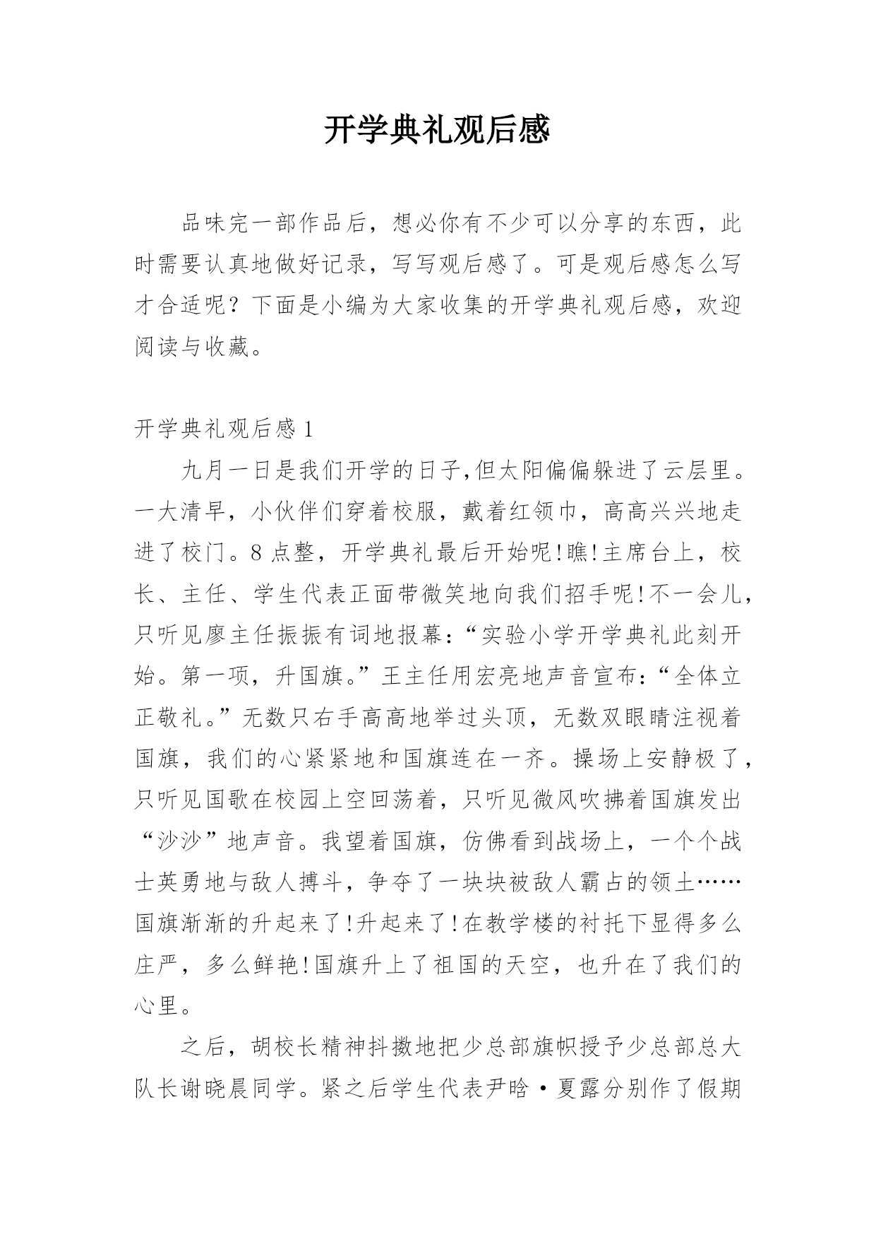 开学典礼观后感品味完一部作品后,想必你有不少可以分享的东西,此时需要认真地做好记录,写写观后感了。可是观后感怎么写才合适呢?下面是小编为大家收集的开学典礼观后感,欢迎阅读与收藏。开学典礼观后感1九月一日是我们开学的日子,但太阳偏偏躲进了云层里。一大清早,小伙伴们穿着校服,戴着红领巾,高高兴兴地走进了校门。8点整,开学典礼最后开始呢!瞧!主席台上,校长、主任、学生代表正面带微笑地向我们招手呢!不一会儿,只听见廖主任振振有词地报幕:“实验小学开学典礼此刻开始。第一项,升国旗。”王主任用宏亮地声音宣布:“全体立