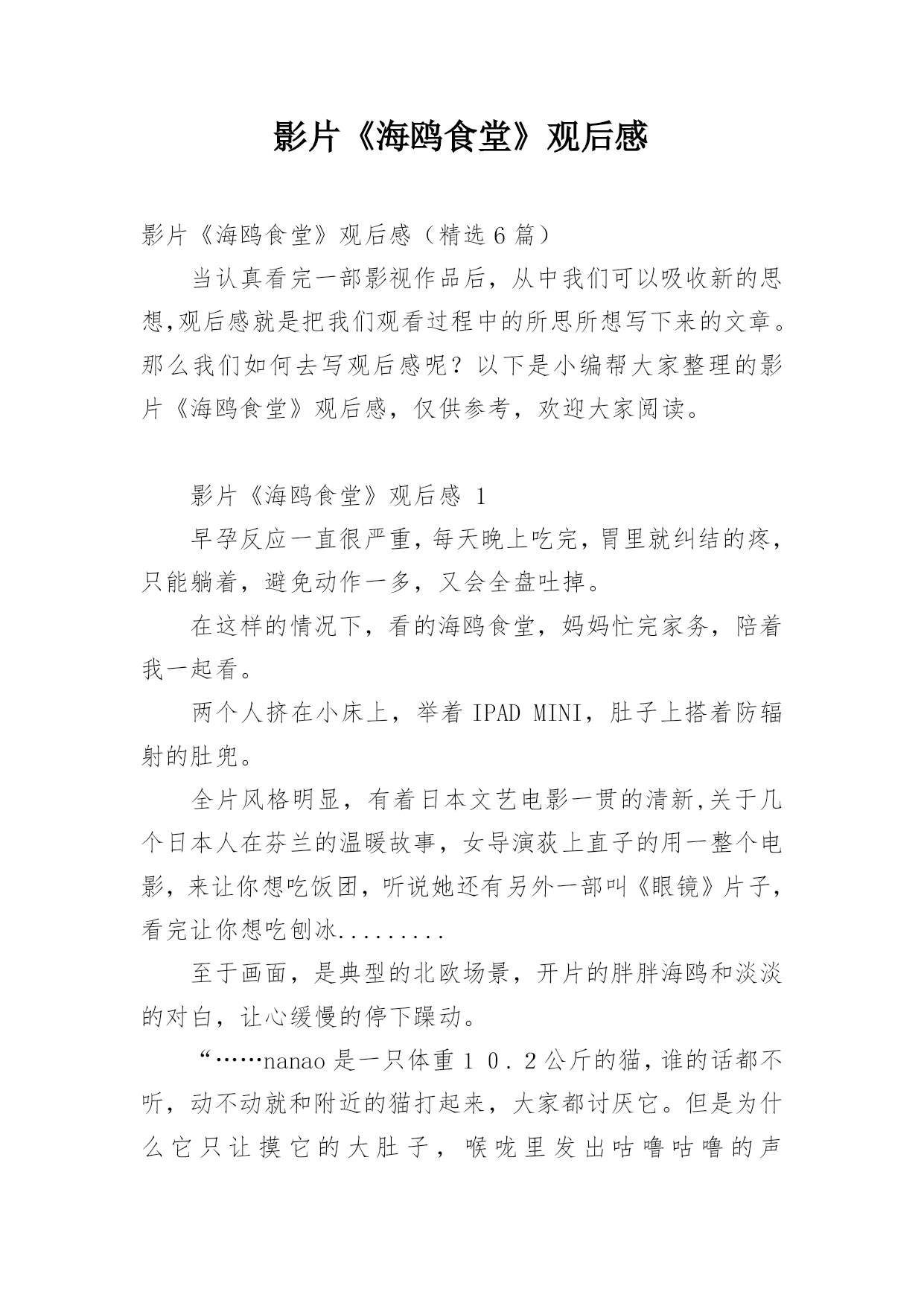 影片《海鸥食堂》观后感影片《海鸥食堂》观后感(精选6篇)当认真看完一部影视作品后,从中我们可以吸收新的思想,观后感就是把我们观看过程中的所思所想写下来的文章。那么我们如何去写观后感呢?以下是小编帮大家整理的影片《海鸥食堂》观后感,仅供参考,欢迎大家阅读。影片《海鸥食堂》观后感1早孕反应一直很严重,每天晚上吃完,胃里就纠结的疼,只能躺着,避免动作一多,又会全盘吐掉。在这样的情况下,看的海鸥食堂,妈妈忙完家务,陪着我一起看。两个人挤在小床上,举着IPADMINI,肚子上搭着防辐射的肚兜。全片风格明显,有着日本