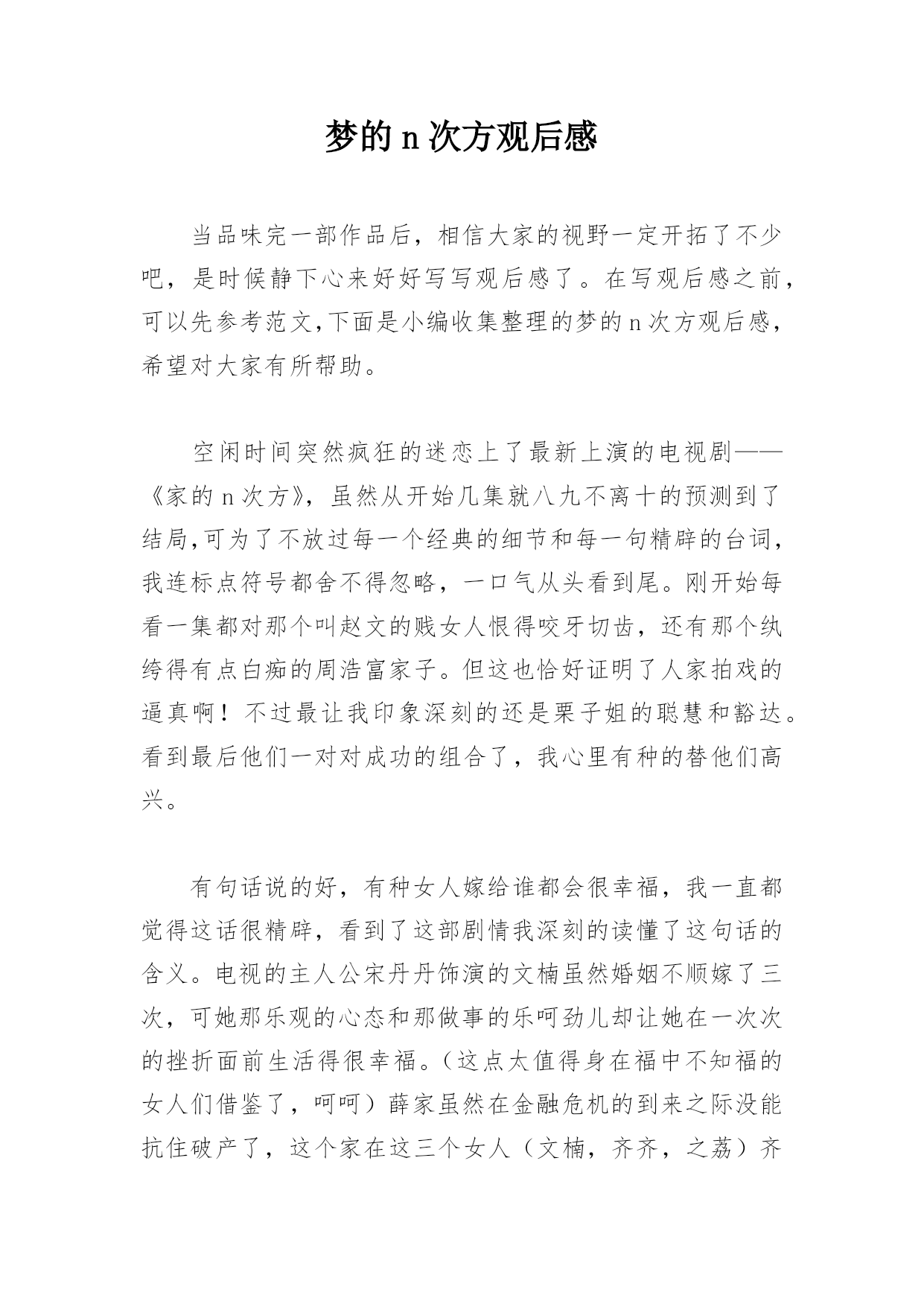 梦的n次方观后感当品味完一部作品后,相信大家的视野一定开拓了不少吧,是时候静下心来好好写写观后感了。在写观后感之前,可以先参考范文,下面是小编收集整理的梦的n次方观后感,希望对大家有所帮助。空闲时间突然疯狂的迷恋上了最新上演的电视剧——《家的n次方》,虽然从开始几集就八九不离十的预测到了结局,可为了不放过每一个经典的细节和每一句精辟的台词,我连标点符号都舍不得忽略,一口气从头看到尾。刚开始每看一集都对那个叫赵文的贱女人恨得咬牙切齿,还有那个纨绔得有点白痴的周浩富家子。但这也恰好证明了人家拍戏的逼真啊!不过