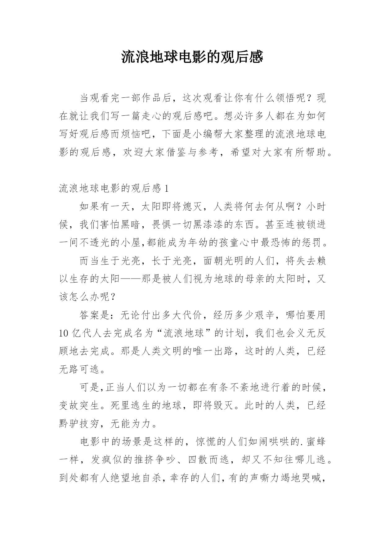 流浪地球电影的观后感当观看完一部作品后,这次观看让你有什么领悟呢?现在就让我们写一篇走心的观后感吧。想必许多人都在为如何写好观后感而烦恼吧,下面是小编帮大家整理的流浪地球电影的观后感,欢迎大家借鉴与参考,希望对大家有所帮助。流浪地球电影的观后感1如果有一天,太阳即将熄灭,人类将何去何从啊?小时候,我们害怕黑暗,畏惧一切黑漆漆的东西。甚至连被锁进一间不透光的小屋,都能成为年幼的孩童心中最恐怖的惩罚。而当生于光亮,长于光亮,面朝光明的人们,将失去赖以生存的太阳——那是被人们视为地球的母亲的太阳时,又该怎么办呢