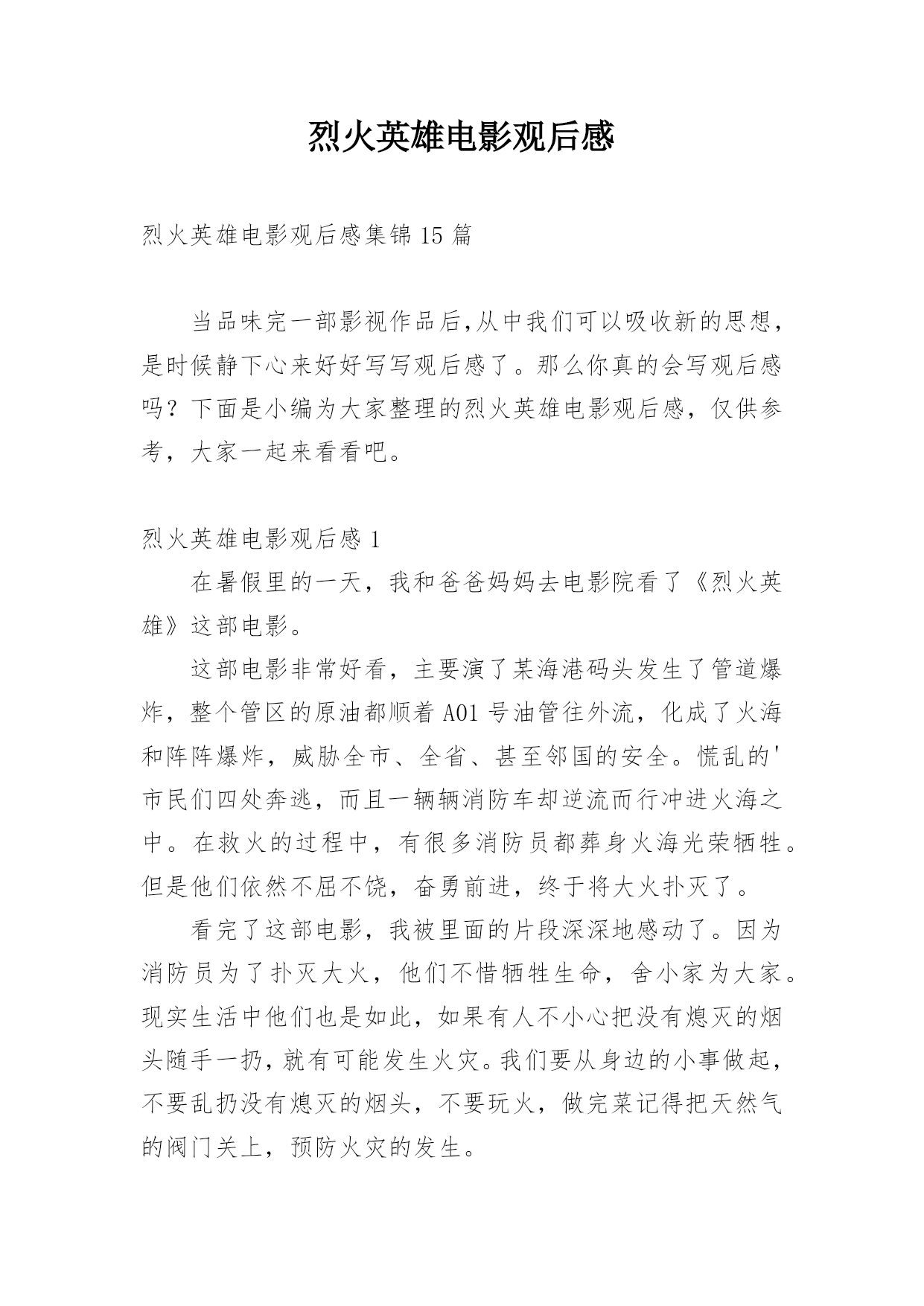 烈火英雄电影观后感烈火英雄电影观后感集锦15篇当品味完一部影视作品后,从中我们可以吸收新的思想,是时候静下心来好好写写观后感了。那么你真的会写观后感吗?下面是小编为大家整理的烈火英雄电影观后感,仅供参考,大家一起来看看吧。烈火英雄电影观后感1在暑假里的一天,我和爸爸妈妈去电影院看了《烈火英雄》这部电影。这部电影非常好看,主要演了某海港码头发生了管道爆炸,整个管区的原油都顺着A01号油管往外流,化成了火海和阵阵爆炸,威胁全市、全省、甚至邻国的安全。慌乱的'市民们四处奔逃,而且一辆辆消防车却逆流而行冲进火海之