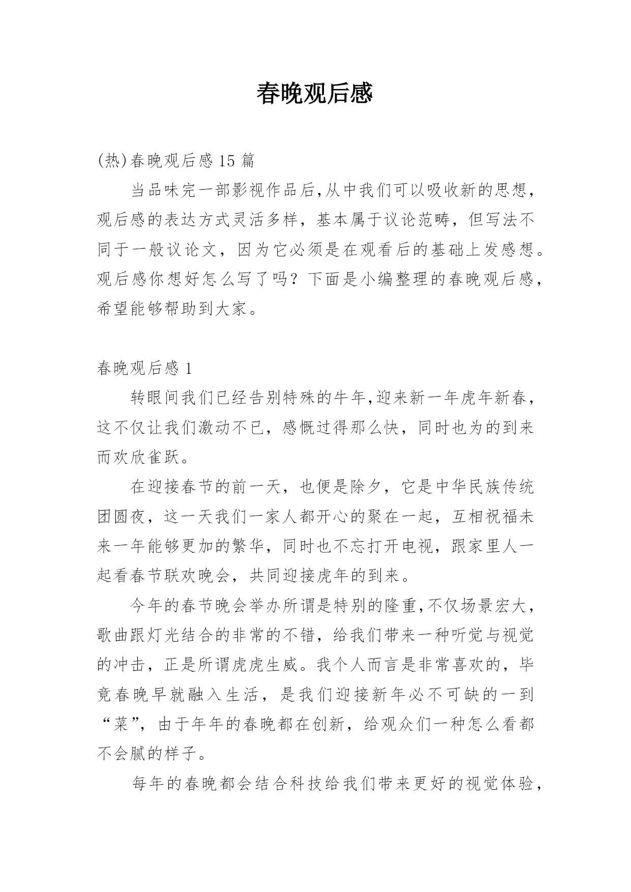 春晚观后感(热)春晚观后感15篇当品味完一部影视作品后,从中我们可以吸收新的思想,观后感的表达方式灵活多样,基本属于议论范畴,但写法不同于一般议论文,因为它必须是在观看后的基础上发感想。观后感你想好怎么写了吗?下面是小编整理的春晚观后感,希望能够帮助到大家。春晚观后感1转眼间我们已经告别特殊的牛年,迎来新一年虎年新春,这不仅让我们激动不已,感慨过得那么快,同时也为的到来而欢欣雀跃。在迎接春节的前一天,也便是除夕,它是中华民族传统团圆夜,这一天我们一家人都开心的聚在一起,互相祝福未来一年能够更加的繁华,同时