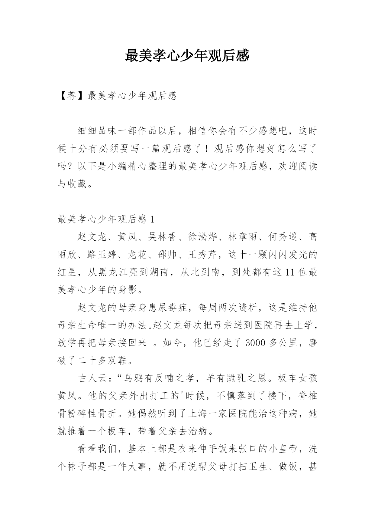最美孝心少年观后感【荐】最美孝心少年观后感细细品味一部作品以后,相信你会有不少感想吧,这时候十分有必须要写一篇观后感了!观后感你想好怎么写了吗?以下是小编精心整理的最美孝心少年观后感,欢迎阅读与收藏。最美孝心少年观后感1赵文龙、黄凤、吴林香、徐泌烨、林章雨、何秀巡、高雨欣、路玉婷、龙花、邵帅、王秀芹,这十一颗闪闪发光的红星,从黑龙江亮到湖南,从北到南,到处都有这11位最美孝心少年的身影。赵文龙的母亲身患尿毒症,每周两次透析,这是维持他母亲生命唯一的办法。赵文龙每次把母亲送到医院再去上学,放学再把母亲接回来