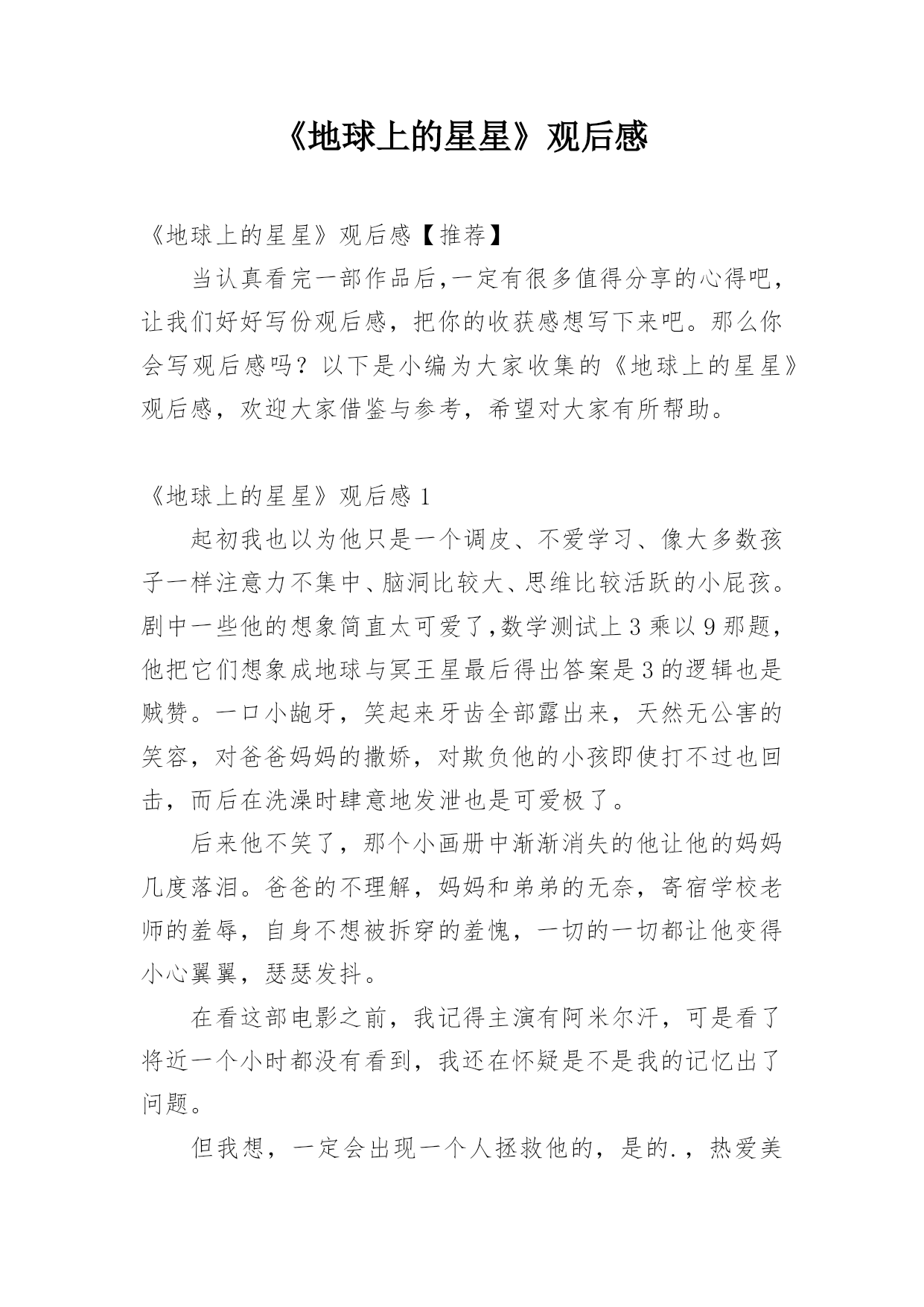《地球上的星星》观后感《地球上的星星》观后感【推荐】当认真看完一部作品后,一定有很多值得分享的心得吧,让我们好好写份观后感,把你的收获感想写下来吧。那么你会写观后感吗?以下是小编为大家收集的《地球上的星星》观后感,欢迎大家借鉴与参考,希望对大家有所帮助。《地球上的星星》观后感1起初我也以为他只是一个调皮、不爱学习、像大多数孩子一样注意力不集中、脑洞比较大、思维比较活跃的小屁孩。剧中一些他的想象简直太可爱了,数学测试上3乘以9那题,他把它们想象成地球与冥王星最后得出答案是3的逻辑也是贼赞。一口小龅牙,笑起来
