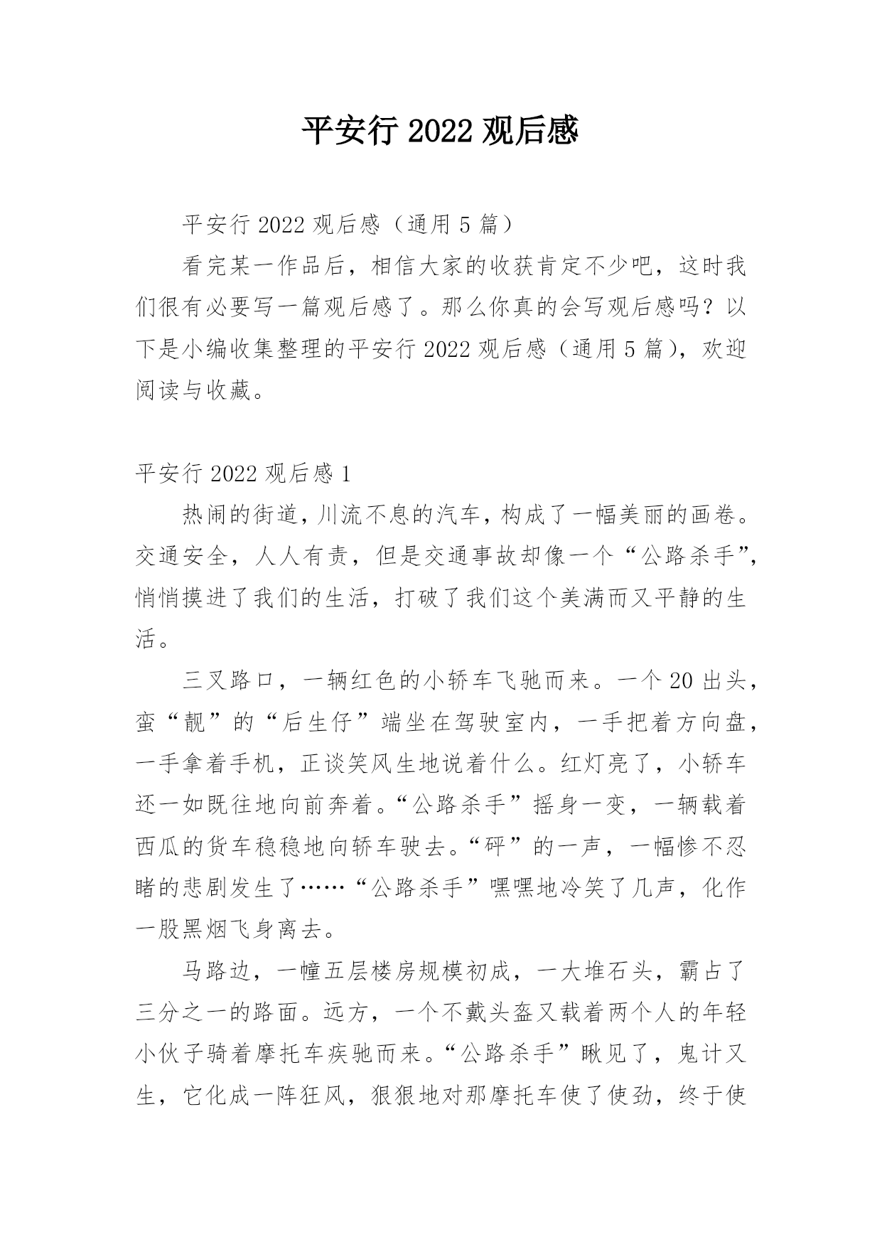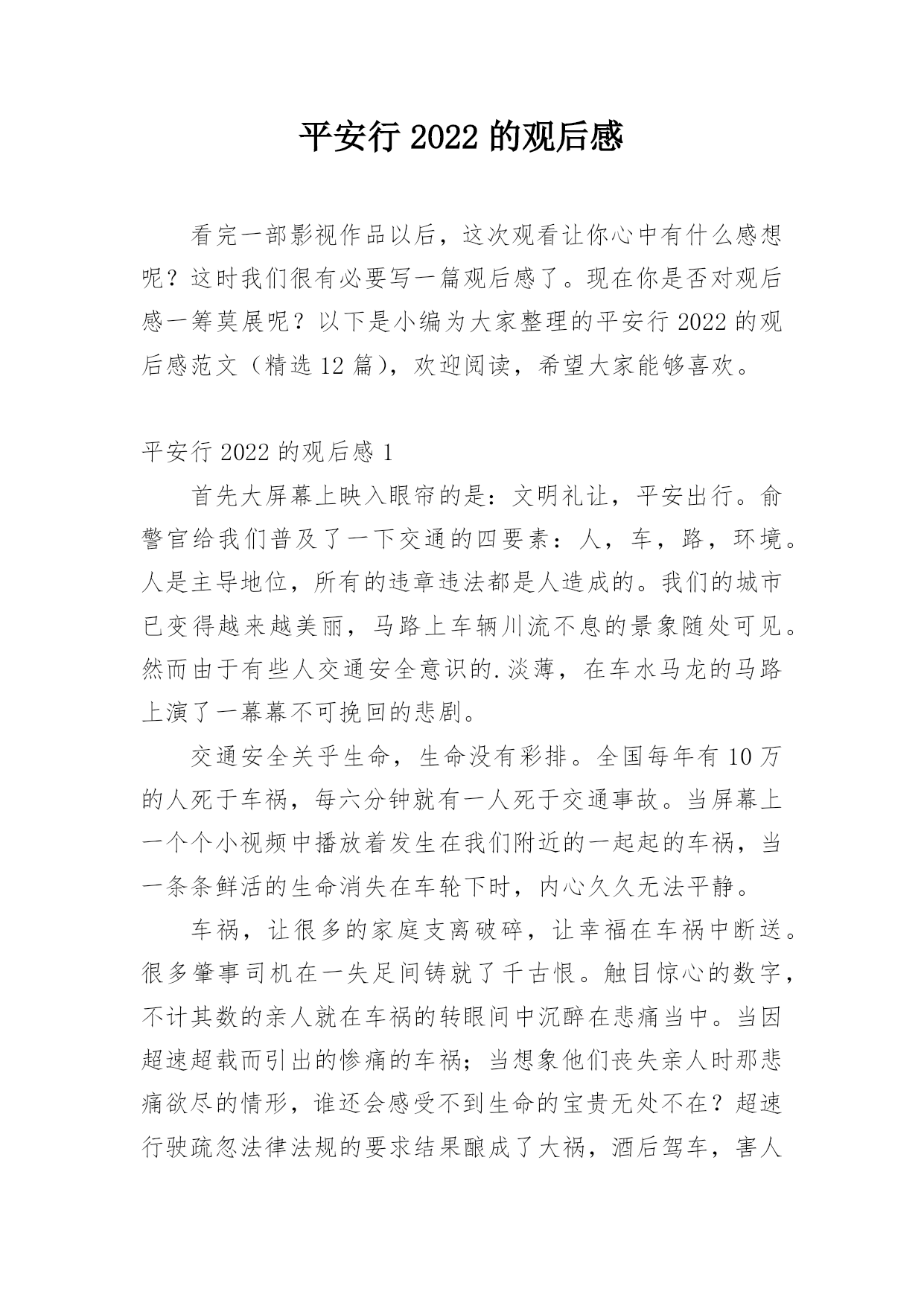 平安行2022的观后感看完一部影视作品以后,这次观看让你心中有什么感想呢?这时我们很有必要写一篇观后感了。现在你是否对观后感一筹莫展呢?以下是小编为大家整理的平安行2022的观后感范文(精选12篇),欢迎阅读,希望大家能够喜欢。平安行2022的观后感1首先大屏幕上映入眼帘的是:文明礼让,平安出行。俞警官给我们普及了一下交通的四要素:人,车,路,环境。人是主导地位,所有的违章违法都是人造成的。我们的城市已变得越来越美丽,马路上车辆川流不息的景象随处可见。然而由于有些人交通安全意识的.淡薄,在车水马龙的马路上