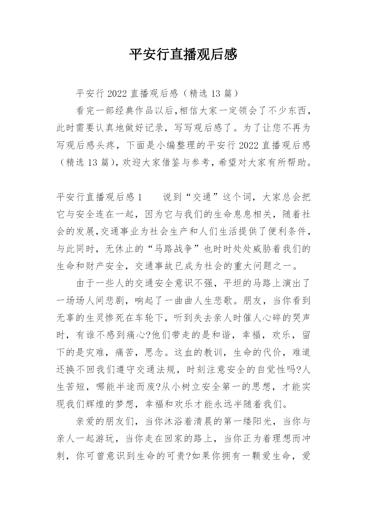 平安行直播观后感平安行2022直播观后感(精选13篇)看完一部经典作品以后,相信大家一定领会了不少东西,此时需要认真地做好记录,写写观后感了。为了让您不再为写观后感头疼,下面是小编整理的平安行2022直播观后感(精选13篇),欢迎大家借鉴与参考,希望对大家有所帮助。平安行直播观后感1说到“交通”这个词,大家总会把它与安全连在一起,因为它与我们的生命息息相关,随着社会的发展,交通事业为社会生产和人们生活提供了便利条件,与此同时,无休止的“马路战争”也时时处处威胁着我们的生命和财产安全,交通事故已成为社会的重