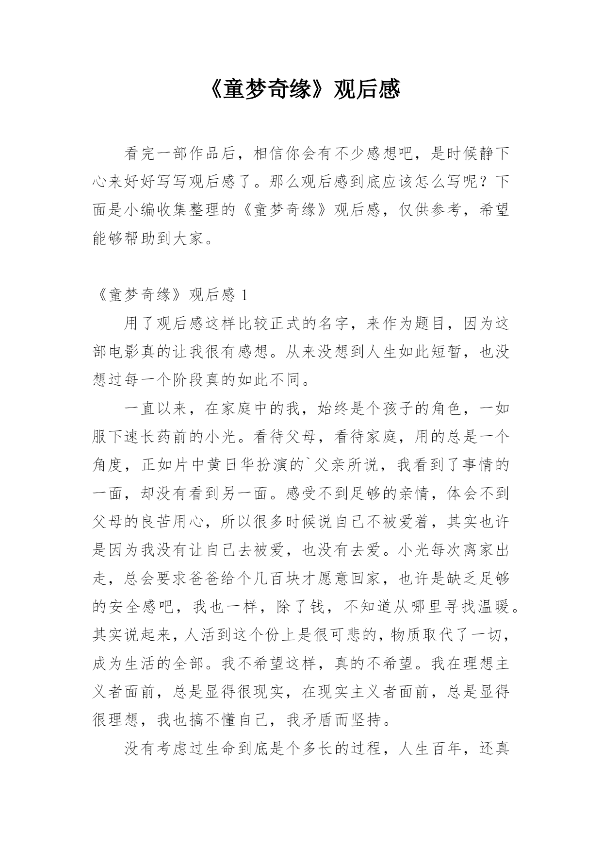 《童梦奇缘》观后感看完一部作品后,相信你会有不少感想吧,是时候静下心来好好写写观后感了。那么观后感到底应该怎么写呢?下面是小编收集整理的《童梦奇缘》观后感,仅供参考,希望能够帮助到大家。《童梦奇缘》观后感1用了观后感这样比较正式的名字,来作为题目,因为这部电影真的让我很有感想。从来没想到人生如此短暂,也没想过每一个阶段真的如此不同。一直以来,在家庭中的我,始终是个孩子的角色,一如服下速长药前的小光。看待父母,看待家庭,用的总是一个角度,正如片中黄日华扮演的`父亲所说,我看到了事情的一面,却没有看到另一面。